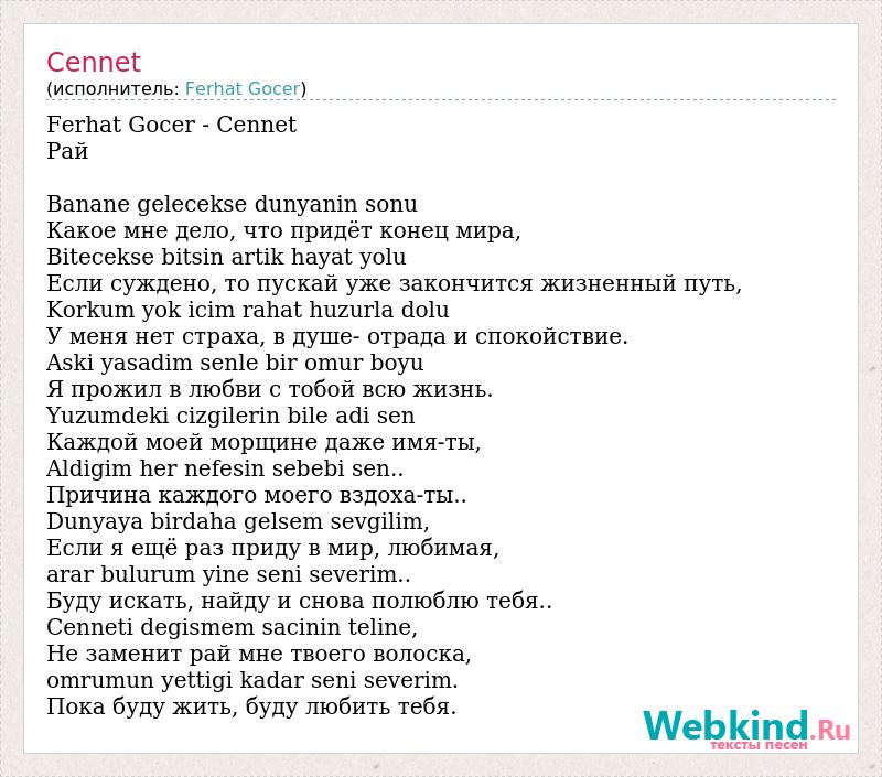 Ferhat Gocer - Cennet Рай Banane gelecekse dunyanin sonu Какое мне дело, что придёт конец мира, Bitecekse bitsin artik hayat yolu Если суждено, то пускай уже закончится жизненный путь, Korkum yok icim rahat huzurla dolu У меня нет страха, в душе- отрада и спокойствие. Aski yasadim senle bir omur boyu Я прожил в любви с тобой всю жизнь. Yuzumdeki cizgilerin bile adi sen Каждой моей морщине даже имя-ты, Aldigim her nefesin sebebi sen.. Причина каждого моего вздоха-ты.. Dunyaya birdaha gelsem sevgilim, Если я ещё раз приду в мир, любимая, arar bulurum yine seni severim.. Буду искать, найду и снова полюблю тебя.. Cenneti degismem sacinin teline, Не заменит рай мне твоего волоска, omrumun yettigi kadar seni severim. Пока буду жить, буду любить тебя.