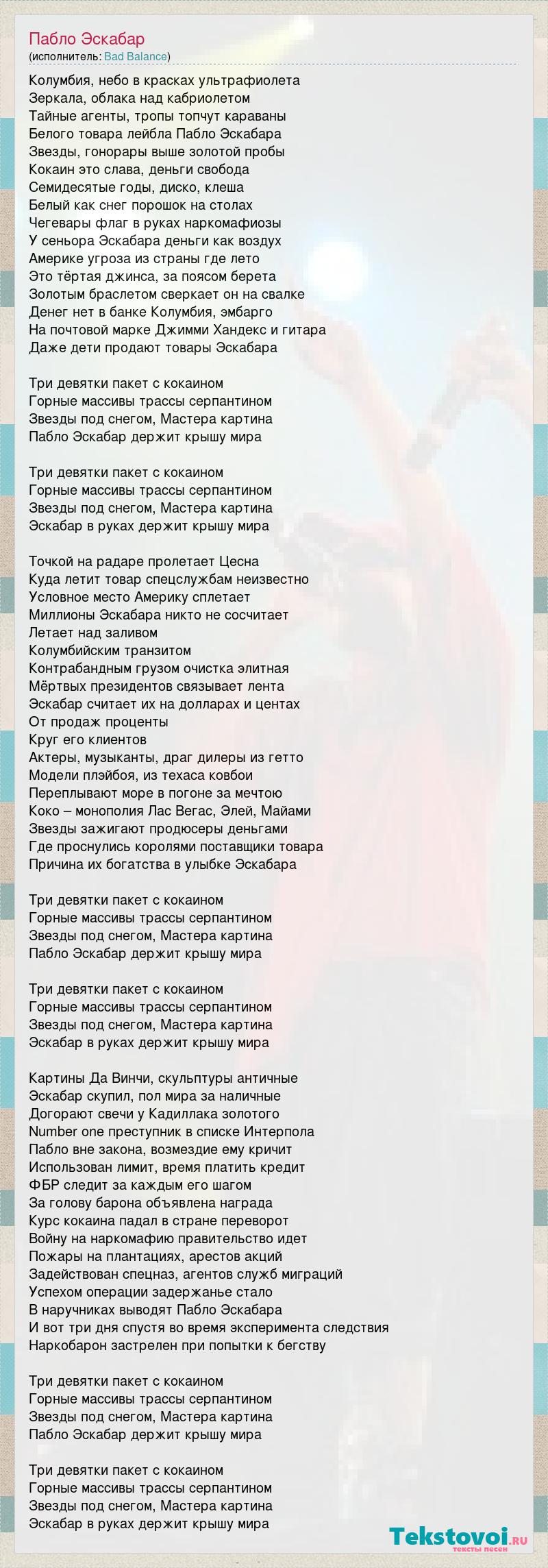 Колумбия, небо в красках ультрафиолета Зеркала, облака над кабриолетом Тайные агенты, тропы топчут караваны Белого товара лейбла Пабло Эскабара Звезды, гонорары выше золотой пробы Кокаин это слава, деньги свобода Семидесятые годы, диско, клеша Белый как снег порошок на столах Чегевары флаг в руках наркомафиозы У сеньора Эскабара деньги как воздух Америке угроза из страны где лето Это тёртая джинса, за поясом берета Золотым браслетом сверкает он на свалке Денег нет в банке Колумбия, эмбарго На почтовой марке Джимми Хандекс и гитара Даже дети продают товары Эскабара Три девятки пакет с кокаином Горные массивы трассы серпантином Звезды под снегом, Мастера картина Пабло Эскабар держит крышу мира Три девятки пакет с кокаином Горные массивы трассы серпантином Звезды под снегом, Мастера картина Эскабар в руках держит крышу мира Точкой на радаре пролетает Цесна Куда летит товар спецслужбам неизвестно Условное место Америку сплетает Миллионы Эскабара никто не сосчитает Летает над заливом Колумбийским транзитом Контрабандным грузом очистка элитная Мёртвых президентов связывает лента Эскабар считает их на долларах и центах От продаж проценты Круг его клиентов Актеры, музыканты, драг дилеры из гетто Модели плэйбоя, из техаса ковбои Переплывают море в погоне за мечтою Коко – монополия Лас Вегас, Элей, Майами Звезды зажигают продюсеры деньгами Где проснулись королями поставщики товара Причина их богатства в улыбке Эскабара Три девятки пакет с кокаином Горные массивы трассы серпантином Звезды под снегом, Мастера картина Пабло Эскабар держит крышу мира Три девятки пакет с кокаином Горные массивы трассы серпантином Звезды под снегом, Мастера картина Эскабар в руках держит крышу мира Картины Да Винчи, скульптуры античные Эскабар скупил, пол мира за наличные Догорают свечи у Кадиллака золотого Number one преступник в списке Интерпола Пабло вне закона, возмездие ему кричит Использован лимит, время платить кредит ФБР следит за каждым его шагом За голову барона объявлена награда Курс кокаина падал в стране переворот Войну на наркомафию правительство идет Пожары на плантациях, арестов акций Задействован спецназ, агентов служб миграций Успехом операции задержанье стало В наручниках выводят Пабло Эскабара И вот три дня спустя во время эксперимента следствия Наркобарон застрелен при попытки к бегству Три девятки пакет с кокаином Горные массивы трассы серпантином Звезды под снегом, Мастера картина Пабло Эскабар держит крышу мира Три девятки пакет с кокаином Горные массивы трассы серпантином Звезды под снегом, Мастера картина Эскабар в руках держит крышу мира