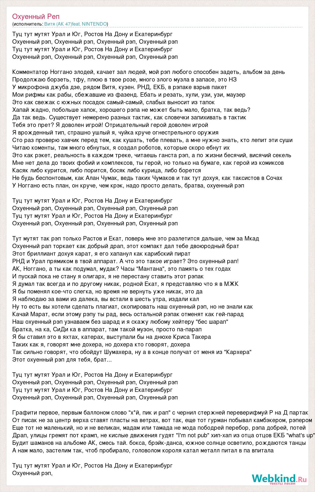 Туц тут мутят Урал и Юг, Ростов На Дону и Екатеринбург Охуенный рэп, Охуенный рэп, Охуенный рэп, Охуенный рэп Туц тут мутят Урал и Юг, Ростов На Дону и Екатеринбург Охуенный рэп, Охуенный рэп, Охуенный рэп, Охуенный рэп Комментатор Ноггано злодей, качает зал людей, мой рэп любого способен задеть, альбом за день Продолжаю борзеть, тфу, плюю в твое розе, много злого музла в запасе, это НЗ У микрофона джуба дзе, рядом Витя, кузен. РНД, ЕКБ, в рэпаке взрыв пакет Мои рифмы как рабы, сбежавшие из фазенд. Ебать и резать, хули, узи, узи, маузер Это как свежак с южных посадок самый-самый, слабых выносит из тапок Хапай жадно, побольше хапок, хорошего рэпа не может быть мало, братка, так ведь? Да так ведь. Существует немерено разных тактик, как словечки запихивать в тактик Тебя это прет? Я доволен игрой! Отрицательный герой доволен игрой Я врожденный тип, страшно ушлый я, чуйка круче огнестрельного оружия Сто раз проверю хавчик перед тем, как кушать, тебе плевать, а мне нужно знать, кто лепит эти суши Читаю коменты, там много ебнутых, я создал роботов, которые скоро ебнут их Это как рэкет, реальность в каждом треке, читаешь ганста рэп, а по жизни бесячий, висячий секель Мне нет дела до твоих фобий и комплексов, ты герой, но только на бумаге, как герой из комиксов Касяк либо курится, либо порится, босяк либо курица, либо борется Не будь беспонтовым, как Алан Чумак, ведь таких Чумаков и так тут дохуя, как таксистов в Сочах У Ноггано есть план, он круче, чем крэк, надо просто делать, братва, охуенный рэп Туц тут мутят Урал и Юг, Ростов На Дону и Екатеринбург Охуенный рэп, Охуенный рэп, Охуенный рэп, Охуенный рэп Туц тут мутят Урал и Юг, Ростов На Дону и Екатеринбург Охуенный рэп, Охуенный рэп, Охуенный рэп, Охуенный рэп Тут мутят так рэп только Растов и Екат, поверь мне это разлетится дальше, чем за Мкад Охуенный рап торкает как добрый драп, этот компакт дал тебе двоюродный брат Этот бриллиант дохуя карат, я его хапанул как карибский пират РНД и Урал прямиком в твой аппарат. А что это такое играет? Это охуенный рап! АК, Ноггано, а ты как подумал, мудак? Часы "Мантана", это память о тех годах И пускай пока не стану я олигарх, я не перестану ставить этот рэпак Я думал так всегда и по другому никак, родной Екат, я представляю что я в МЖК Я бы поменял кое-что слегка, но время не вернуть уже никак, это да Я наблюдаю за вами из далека, вы встали в шесть утра, издали кал Ну то есть вы хотели сделать плагиат, скопировать наш охуенный рэп, но не знали как Качай Марат, если этому рэпу ты рад, весь остальной рэпак отменят как гей-парад Наш охуенный рэп узнаваем без шарад и я скажу любому хейтеру "бес шарап" Братка, на ка, СиДи ка в аппарат, там такой музон, просто па-парап Я бы ставил это в яхтах, катерах, выступали бы на днюхе Криса Такера Таких как я, говорят мне дохера, но дохера кто говорят, дохера Так сильно говорят, что обойдут Шумахера, ну а в конце получат от меня из "Кархера" Этот охуенный рэп для тебя, брат... Туц тут мутят Урал и Юг, Ростов На Дону и Екатеринбург Охуенный рэп, Охуенный рэп, Охуенный рэп, Охуенный рэп Туц тут мутят Урал и Юг, Ростов На Дону и Екатеринбург Охуенный рэп, Охуенный рэп, Охуенный рэп, Охуенный рэп Графити первое, первым баллоном слово "х*й, пик и рап" с чернил стержней переверифмуй Р на Д партак От писак не за центр верха ставят пласты на ветрах, вот так, еще тот гурман побывал камбэ