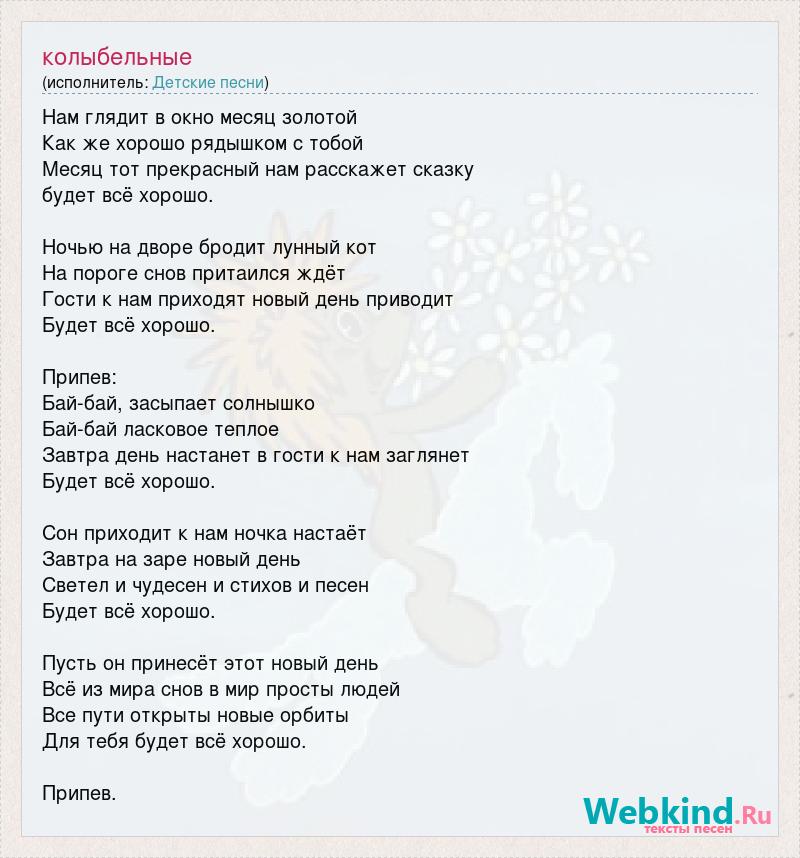 Нам глядит в окно месяц золотой Как же хорошо рядышком с тобой Месяц тот прекрасный нам расскажет сказку будет всё хорошо. Ночью на дворе бродит лунный кот На пороге снов притаился ждёт Гости к нам приходят новый день приводит Будет всё хорошо. Припев: Бай-бай, засыпает солнышко Бай-бай ласковое теплое Завтра день настанет в гости к нам заглянет Будет всё хорошо. Сон приходит к нам ночка настаёт Завтра на заре новый день Светел и чудесен и стихов и песен Будет всё хорошо. Пусть он принесёт этот новый день Всё из мира снов в мир просты людей Все пути открыты новые орбиты Для тебя будет всё хорошо. Припев.