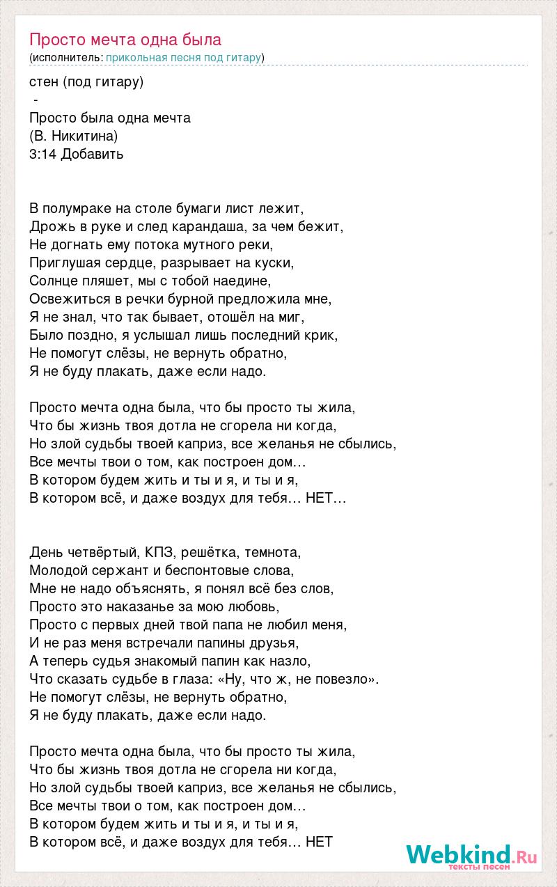 стен (под гитару) - Просто была одна мечта (В. Никитина) 3:14 Добавить В полумраке на столе бумаги лист лежит, Дрожь в руке и след карандаша, за чем бежит, Не догнать ему потока мутного реки, Приглушая сердце, разрывает на куски, Солнце пляшет, мы с тобой наедине, Освежиться в речки бурной предложила мне, Я не знал, что так бывает, отошёл на миг, Было поздно, я услышал лишь последний крик, Не помогут слёзы, не вернуть обратно, Я не буду плакать, даже если надо. Просто мечта одна была, что бы просто ты жила, Что бы жизнь твоя дотла не сгорела ни когда, Но злой судьбы твоей каприз, все желанья не сбылись, Все мечты твои о том, как построен дом… В котором будем жить и ты и я, и ты и я, В котором всё, и даже воздух для тебя… НЕТ… День четвёртый, КПЗ, решётка, темнота, Молодой сержант и беспонтовые слова, Мне не надо объяснять, я понял всё без слов, Просто это наказанье за мою любовь, Просто с первых дней твой папа не любил меня, И не раз меня встречали папины друзья, А теперь судья знакомый папин как назло, Что сказать судьбе в глаза: «Ну, что ж, не повезло». Не помогут слёзы, не вернуть обратно, Я не буду плакать, даже если надо. Просто мечта одна была, что бы просто ты жила, Что бы жизнь твоя дотла не сгорела ни когда, Но злой судьбы твоей каприз, все желанья не сбылись, Все мечты твои о том, как построен дом… В котором будем жить и ты и я, и ты и я, В котором всё, и даже воздух для тебя… НЕТ