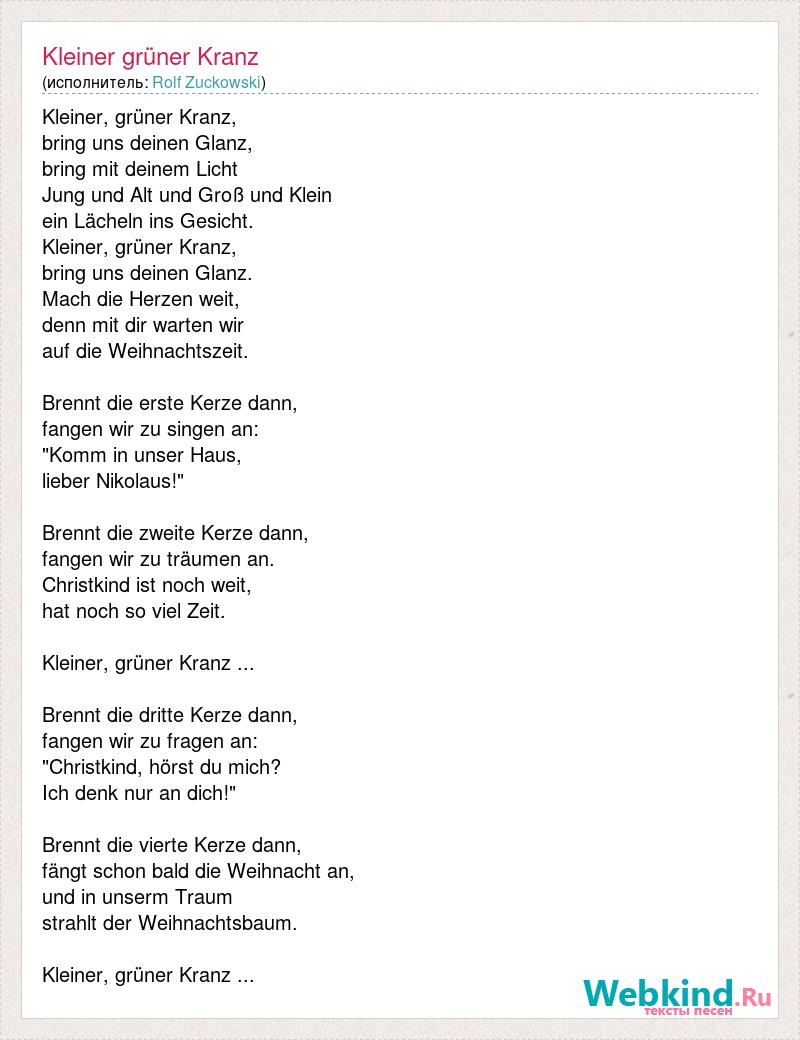 Kleiner, grüner Kranz, bring uns deinen Glanz, bring mit deinem Licht Jung und Alt und Groß und Klein ein Lächeln ins Gesicht. Kleiner, grüner Kranz, bring uns deinen Glanz. Mach die Herzen weit, denn mit dir warten wir auf die Weihnachtszeit. Brennt die erste Kerze dann, fangen wir zu singen an: "Komm in unser Haus, lieber Nikolaus!" Brennt die zweite Kerze dann, fangen wir zu träumen an. Christkind ist noch weit, hat noch so viel Zeit. Kleiner, grüner Kranz ... Brennt die dritte Kerze dann, fangen wir zu fragen an: "Christkind, hörst du mich? Ich denk nur an dich!" Brennt die vierte Kerze dann, fängt schon bald die Weihnacht an, und in unserm Traum strahlt der Weihnachtsbaum. Kleiner, grüner Kranz ...