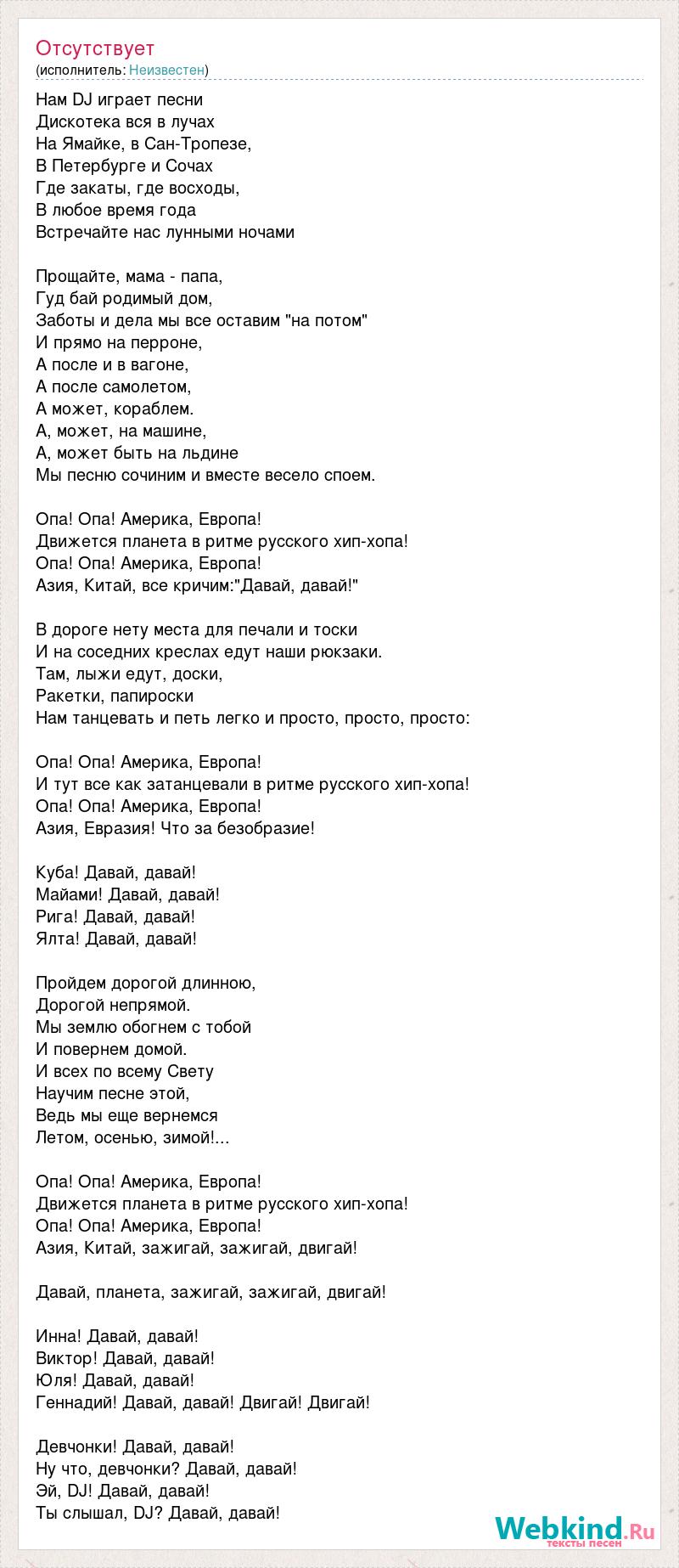 Нам DJ играет песни Дискотека вся в лучах На Ямайке, в Сан-Тропезе, В Петербурге и Сочах Где закаты, где восходы, В любое время года Встречайте нас лунными ночами Прощайте, мама - папа, Гуд бай родимый дом, Заботы и дела мы все оставим "на потом" И прямо на перроне, А после и в вагоне, А после самолетом, А может, кораблем. А, может, на машине, А, может быть на льдине Мы песню сочиним и вместе весело споем. Опа! Опа! Америка, Европа! Движется планета в ритме русского хип-хопа! Опа! Опа! Америка, Европа! Азия, Китай, все кричим:"Давай, давай!" В дороге нету места для печали и тоски И на соседних креслах едут наши рюкзаки. Там, лыжи едут, доски, Ракетки, папироски Нам танцевать и петь легко и просто, просто, просто: Опа! Опа! Америка, Европа! И тут все как затанцевали в ритме русского хип-хопа! Опа! Опа! Америка, Европа! Азия, Евразия! Что за безобразие! Куба! Давай, давай! Майами! Давай, давай! Рига! Давай, давай! Ялта! Давай, давай! Пройдем дорогой длинною, Дорогой непрямой. Мы землю обогнем с тобой И повернем домой. И всех по всему Свету Научим песне этой, Ведь мы еще вернемся Летом, осенью, зимой!... Опа! Опа! Америка, Европа! Движется планета в ритме русского хип-хопа! Опа! Опа! Америка, Европа! Азия, Китай, зажигай, зажигай, двигай! Давай, планета, зажигай, зажигай, двигай! Инна! Давай, давай! Виктор! Давай, давай! Юля! Давай, давай! Геннадий! Давай, давай! Двигай! Двигай! Девчонки! Давай, давай! Ну что, девчонки? Давай, давай! Эй, DJ! Давай, давай! Ты слышал, DJ? Давай, давай!