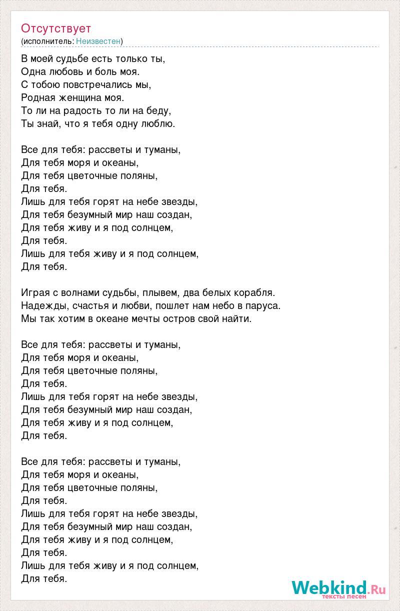 В моей судьбе есть только ты, Одна любовь и боль моя. С тобою повстречались мы, Родная женщина моя. То ли на радость то ли на беду, Ты знай, что я тебя одну люблю. Все для тебя: рассветы и туманы, Для тебя моря и океаны, Для тебя цветочные поляны, Для тебя. Лишь для тебя горят на небе звезды, Для тебя безумный мир наш создан, Для тебя живу и я под солнцем, Для тебя. Лишь для тебя живу и я под солнцем, Для тебя. Играя с волнами судьбы, плывем, два белых корабля. Надежды, счастья и любви, пошлет нам небо в паруса. Мы так хотим в океане мечты остров свой найти. Все для тебя: рассветы и туманы, Для тебя моря и океаны, Для тебя цветочные поляны, Для тебя. Лишь для тебя горят на небе звезды, Для тебя безумный мир наш создан, Для тебя живу и я под солнцем, Для тебя. Все для тебя: рассветы и туманы, Для тебя моря и океаны, Для тебя цветочные поляны, Для тебя. Лишь для тебя горят на небе звезды, Для тебя безумный мир наш создан, Для тебя живу и я под солнцем, Для тебя. Лишь для тебя живу и я под солнцем, Для тебя.