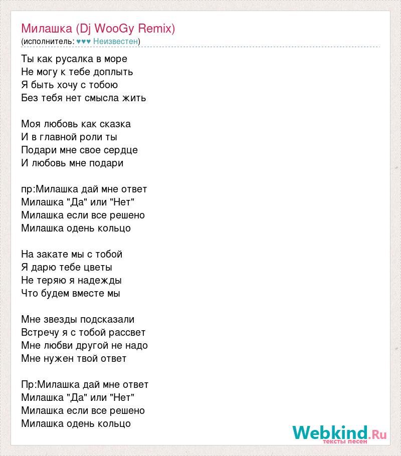 Ты как русалка в море Не могу к тебе доплыть Я быть хочу с тобою Без тебя нет смысла жить Моя любовь как сказка И в главной роли ты Подари мне свое сердце И любовь мне подари пр:Милашка дай мне ответ Милашка "Да" или "Нет" Милашка если все решено Милашка одень кольцо На закате мы с тобой Я дарю тебе цветы Не теряю я надежды Что будем вместе мы Мне звезды подсказали Встречу я с тобой рассвет Мне любви другой не надо Мне нужен твой ответ Пр:Милашка дай мне ответ Милашка "Да" или "Нет" Милашка если все решено Милашка одень кольцо