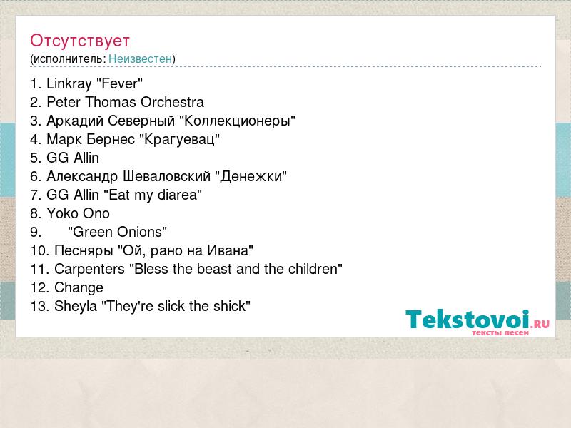 1. Linkray "Fever" 2. Peter Thomas Orchestra 3. Аркадий Северный "Коллекционеры" 4. Марк Бернес "Крагуевац" 5. GG Allin 6. Александр Шеваловский "Денежки" 7. GG Allin "Eat my diarea" 8. Yoko Ono 9. "Green Onions" 10. Песняры "Ой, рано на Ивана" 11. Carpenters "Bless the beast and the children" 12. Change 13. Sheyla "They're slick the shick"