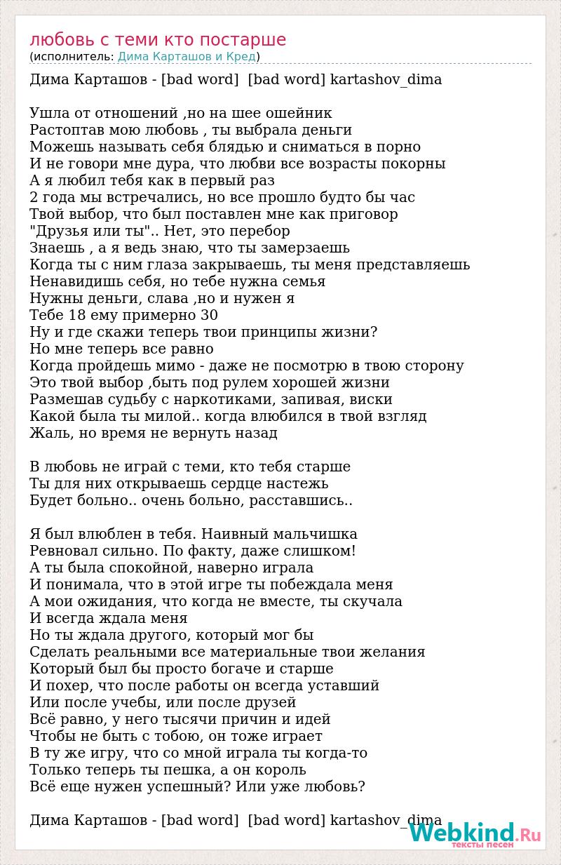 Дима Карташов - [bad word] [bad word] kartashov_dima Ушла от отношений ,но на шее ошейник Растоптав мою любовь , ты выбрала деньги Можешь называть себя блядью и сниматься в порно И не говори мне дура, что любви все возрасты покорны А я любил тебя как в первый раз 2 года мы встречались, но все прошло будто бы час Твой выбор, что был поставлен мне как приговор "Друзья или ты".. Нет, это перебор Знаешь , а я ведь знаю, что ты замерзаешь Когда ты с ним глаза закрываешь, ты меня представляешь Ненавидишь себя, но тебе нужна семья Нужны деньги, слава ,но и нужен я Тебе 18 ему примерно 30 Ну и где скажи теперь твои принципы жизни? Но мне теперь все равно Когда пройдешь мимо - даже не посмотрю в твою сторону Это твой выбор ,быть под рулем хорошей жизни Размешав судьбу с наркотиками, запивая, виски Какой была ты милой.. когда влюбился в твой взгляд Жаль, но время не вернуть назад В любовь не играй с теми, кто тебя старше Ты для них открываешь сердце настежь Будет больно.. очень больно, расставшись.. Я был влюблен в тебя. Наивный мальчишка Ревновал сильно. По факту, даже слишком! А ты была спокойной, наверно играла И понимала, что в этой игре ты побеждала меня А мои ожидания, что когда не вместе, ты скучала И всегда ждала меня Но ты ждала другого, который мог бы Сделать реальными все материальные твои желания Который был бы просто богаче и старше И похер, что после работы он всегда уставший Или после учебы, или после друзей Всё равно, у него тысячи причин и идей Чтобы не быть с тобою, он тоже играет В ту же игру, что со мной играла ты когда-то Только теперь ты пешка, а он король Всё еще нужен успешный? Или уже любовь? Дима Карташов - [bad word] [bad word] kartashov_dima