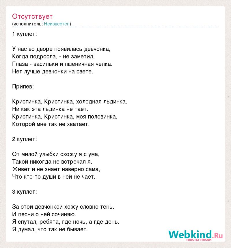 1 куплет: У нас во дворе появилась девчонка, Когда подросла, - не заметил. Глаза - васильки и пшеничная челка. Нет лучше девчонки на свете. Припев: Кристинка, Кристинка, холодная льдинка. Ни как эта льдинка не тает. Кристинка, Кристинка, моя половинка, Которой мне так не хватает. 2 куплет: От милой улыбки схожу я с ума, Такой никогда не встречал я. Живёт и не знает наверно сама, Что кто-то души в ней не чает. 3 куплет: За этой девчонкой хожу словно тень. И песни о ней сочиняю. Я спутал, ребята, где ночь, а где день. Я думал, что так не бывает.