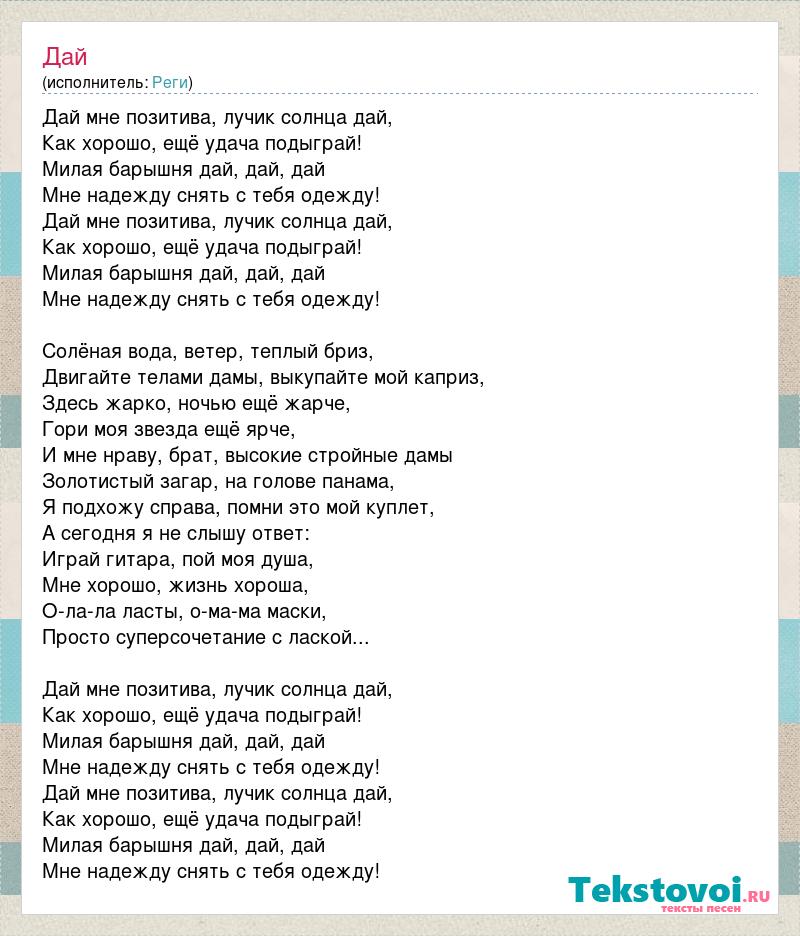 Дай мне позитива, лучик солнца дай, Как хорошо, ещё удача подыграй! Милая барышня дай, дай, дай Мне надежду снять с тебя одежду! Дай мне позитива, лучик солнца дай, Как хорошо, ещё удача подыграй! Милая барышня дай, дай, дай Мне надежду снять с тебя одежду! Солёная вода, ветер, теплый бриз, Двигайте телами дамы, выкупайте мой каприз, Здесь жарко, ночью ещё жарче, Гори моя звезда ещё ярче, И мне нраву, брат, высокие стройные дамы Золотистый загар, на голове панама, Я подхожу справа, помни это мой куплет, А сегодня я не слышу ответ: Играй гитара, пой моя душа, Мне хорошо, жизнь хороша, О-ла-ла ласты, о-ма-ма маски, Просто суперсочетание с лаской... Дай мне позитива, лучик солнца дай, Как хорошо, ещё удача подыграй! Милая барышня дай, дай, дай Мне надежду снять с тебя одежду! Дай мне позитива, лучик солнца дай, Как хорошо, ещё удача подыграй! Милая барышня дай, дай, дай Мне надежду снять с тебя одежду!