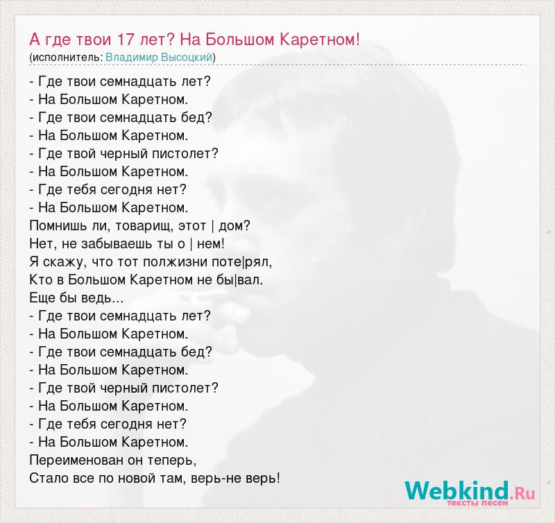- Где твои семнадцать лет? - На Большом Каретном. - Где твои семнадцать бед? - На Большом Каретном. - Где твой черный пистолет? - На Большом Каретном. - Где тебя сегодня нет? - На Большом Каретном. Помнишь ли, товарищ, этот | дом? Нет, не забываешь ты о | нем! Я скажу, что тот полжизни поте|рял, Кто в Большом Каретном не бы|вал. Еще бы ведь... - Где твои семнадцать лет? - На Большом Каретном. - Где твои семнадцать бед? - На Большом Каретном. - Где твой черный пистолет? - На Большом Каретном. - Где тебя сегодня нет? - На Большом Каретном. Переименован он теперь, Стало все по новой там, верь-не верь!