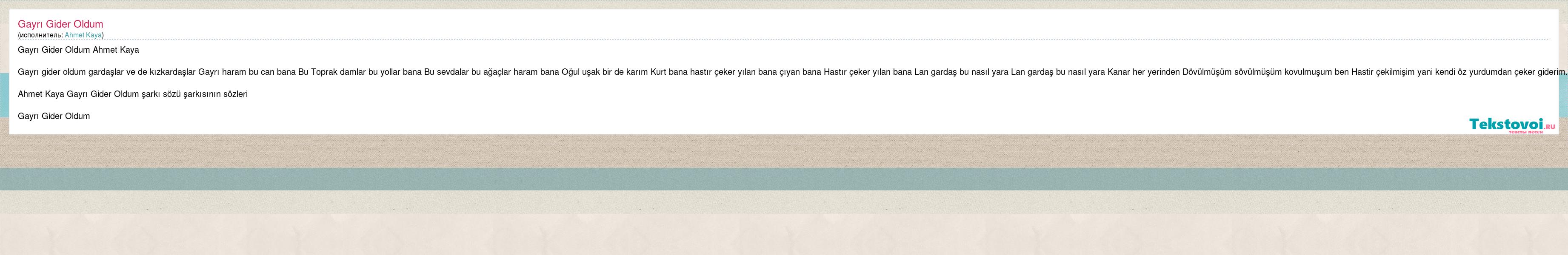 Gayrı Gider Oldum Ahmet Kaya Gayrı gider oldum gardaşlar ve de kızkardaşlar Gayrı haram bu can bana Bu Toprak damlar bu yollar bana Bu sevdalar bu ağaçlar haram bana Oğul uşak bir de karım Kurt bana hastır çeker yılan bana çıyan bana Hastır çeker yılan bana Lan gardaş bu nasıl yara Lan gardaş bu nasıl yara Kanar her yerinden Dövülmüşüm sövülmüşüm kovulmuşum ben Hastir çekilmişim yani kendi öz yurdumdan çeker giderim. Ahmet Kaya Gayrı Gider Oldum şarkı sözü şarkısının sözleri Gayrı Gider Oldum
