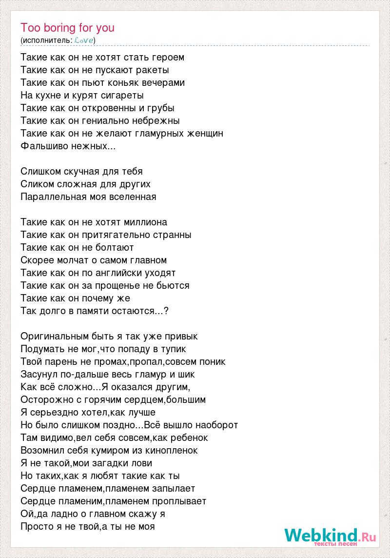 Такие как он не хотят стать героем Такие как он не пускают ракеты Такие как он пьют коньяк вечерами На кухне и курят сигареты Такие как он откровенны и грубы Такие как он гениально небрежны Такие как он не желают гламурных женщин Фальшиво нежных... Слишком скучная для тебя Сликом сложная для других Параллельная моя вселенная Такие как он не хотят миллиона Такие как он притягательно странны Такие как он не болтают Скорее молчат о самом главном Такие как он по английски уходят Такие как он за прощенье не бьются Такие как он почему же Так долго в памяти остаются...? Оригинальным быть я так уже привык Подумать не мог,что попаду в тупик Твой парень не промах,пропал,совсем поник Засунул по-дальше весь гламур и шик Как всё сложно...Я оказался другим, Осторожно с горячим сердцем,большим Я серьездно хотел,как лучше Но было слишком поздно...Всё вышло наоборот Там видимо,вел себя совсем,как ребенок Возомнил себя кумиром из кинопленок Я не такой,мои загадки лови Но таких,как я любят такие как ты Сердце пламенем,пламенем запылает Сердце пламеним,пламенем проплывает Ой,да ладно о главном скажу я Просто я не твой,а ты не моя
