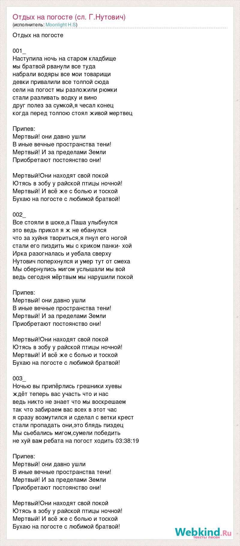 Отдых на погосте 001_ Наступила ночь на старом кладбище мы братвой рванули все туда набрали водяры все мои товарищи девки привалили все толпой сюда сели на погост мы разложили рюмки стали разливать водку и вино друг полез за сумкой,я чесал конец когда перед толпою стоял живой мертвец Припев: Мертвый! они давно ушли В иные вечные пространства тени! Мертвый! И за пределами Земли Приобретают постоянство они! Мертвый!Они находят свой покой Ютясь в зобу у райской птицы ночной! Мертвый! И всё же с болью и тоской Бухаю на погосте с любимой братвой! 002_ Все стояли в шоке,а Паша улыбнулся это ведь прикол я ж не ебанулся что за хуйня твориться,я пнул его ногой стали его пиздить мы с криком панки- хой Ирка разогналась и уебала сверху Нутович поперхнулся и умер тут от смеха Мы обернулись мигом услышали мы вой ведь сегодня мёртвым мы нарушили покой Припев: Мертвый! они давно ушли В иные вечные пространства тени! Мертвый! И за пределами Земли Приобретают постоянство они! Мертвый!Они находят свой покой Ютясь в зобу у райской птицы ночной! Мертвый! И всё же с болью и тоской Бухаю на погосте с любимой братвой! 003_ Ночью вы припёрлись грешники хуевы ждёт теперь вас участь что и нас ведь никто не знает что мы воскрешаем так что забираем вас всех в этот час я сразу возмутился и сделал с ветки крест стали пропадать они,это блядь пиздец Мы сьебались мигом,сумели победить не хуй вам ребата на погост ходить 03:38:19 Припев: Мертвый! они давно ушли В иные вечные пространства тени! Мертвый! И за пределами Земли Приобретают постоянство они! Мертвый!Они находят свой покой Ютясь в зобу у райской птицы ночной! Мертвый! И всё же с болью и тоской Бухаю на погосте с любимой братвой!