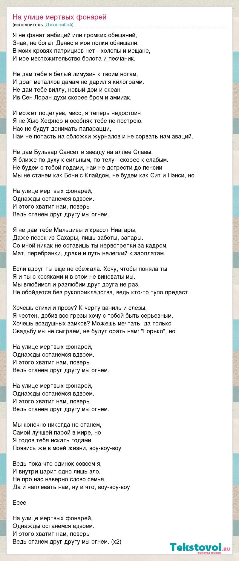Я не фанат амбиций или громких обещаний, Знай, не богат Денис и мои полки обнищали. В моих кровях патрициев нет - холопы и мещане, И мое местожительство болота и песчаник. Не дам тебе я белый лимузин к твоим ногам, И драг металлов дамам не дарил я килограмм. Не дам тебе виллу, новый дом и океан Ив Сен Лоран духи скорее бром и аммиак. И может поцелуев, мисс, я теперь недостоин Я не Хью Хефнер и особняк тебе не построю. Нас не будут донимать папарацци, Нам не попасть на обложки журналов и не сорвать нам аваций. Не дам Бульвар Сансет и звезду на аллее Славы, Я ближе по духу к сильным, по телу - скорее к слабым. Не будем с тобой годами, нам не догрести до пенсии Мы не станем как Бони с Клайдом, не будем как Сит и Нэнси, но На улице мертвых фонарей, Однажды останемся вдвоем. И этого хватит нам, поверь Ведь станем друг другу мы огнем. Я не дам тебе Мальдивы и красот Ниагары, Даже песок из Сахары, лишь заботы, запары. Со мной никак не оставишь ты нервотрепки за кадром, Мат, перебранки, драки и путь нелегкий к зарплатам. Если вдруг ты еще не сбежала. Хочу, чтобы поняла ты Я и ты с косяками и в этом не виноваты мы. Мы влюбимся и разлюбим друг друга не раз, Не обойдется без рукоприкладства, ведь кто-то тупо предаст. Хочешь стихи и прозу? К черту ваниль и слезы, Я честен, добив все грезы хочу с тобой быть серьезным. Хочешь воздушных замков? Можешь мечтать, да только Свадьбу мы не сыграем, не будут орать нам: "Горько", но На улице мертвых фонарей, Однажды останемся вдвоем. И этого хватит нам, поверь Ведь станем друг другу мы огнем. На улице мертвых фонарей, Однажды останемся вдвоем. И этого хватит нам, поверь Ведь станем друг другу мы огнем. Мы конечно никогда не станем, Самой лучшей парой в мире, но Я годов тебя искать годами Появись же в моей жизни, воу-воу-воу Ведь пока-что одинок совсем я, И внутри царит одно лишь зло. Не про нас наверно слово семья, Да и наплевать нам, ну и что, воу-воу-воу Ееее На улице мертвых фонарей, Однажды останемся вдвоем. И этого хватит нам, поверь Ведь станем друг другу мы огнем. (x2)