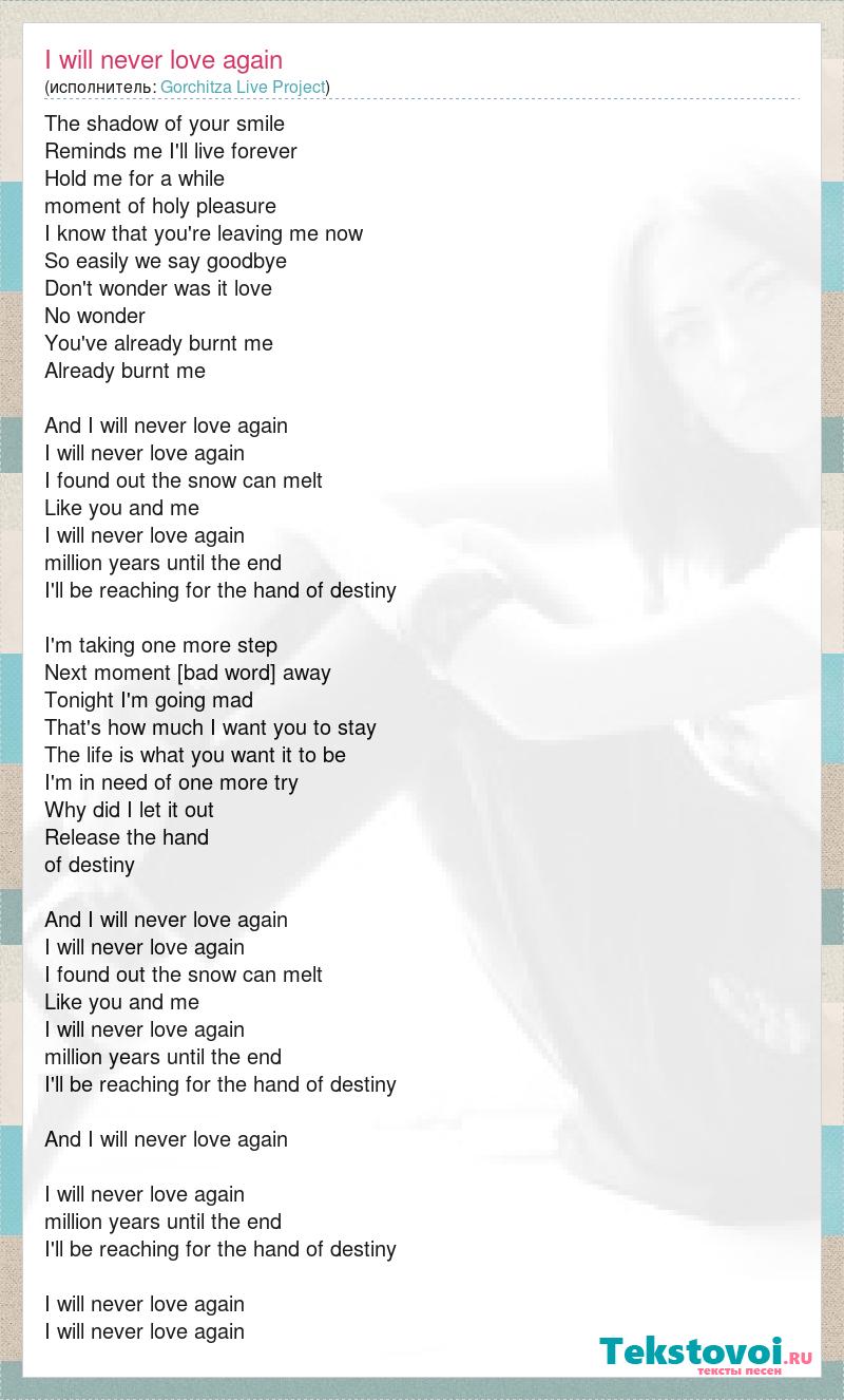 The shadow of your smile Reminds me I'll live forever Hold me for a while moment of holy pleasure I know that you're leaving me now So easily we say goodbye Don't wonder was it love No wonder You've already burnt me Already burnt me And I will never love again I will never love again I found out the snow can melt Like you and me I will never love again million years until the end I'll be reaching for the hand of destiny I'm taking one more step Next moment I'm running away Tonight I'm going mad That's how much I want you to stay The life is what you want it to be I'm in need of one more try Why did I let it out Release the hand of destiny And I will never love again I will never love again I found out the snow can melt Like you and me I will never love again million years until the end I'll be reaching for the hand of destiny And I will never love again I will never love again million years until the end I'll be reaching for the hand of destiny I will never love again I will never love again