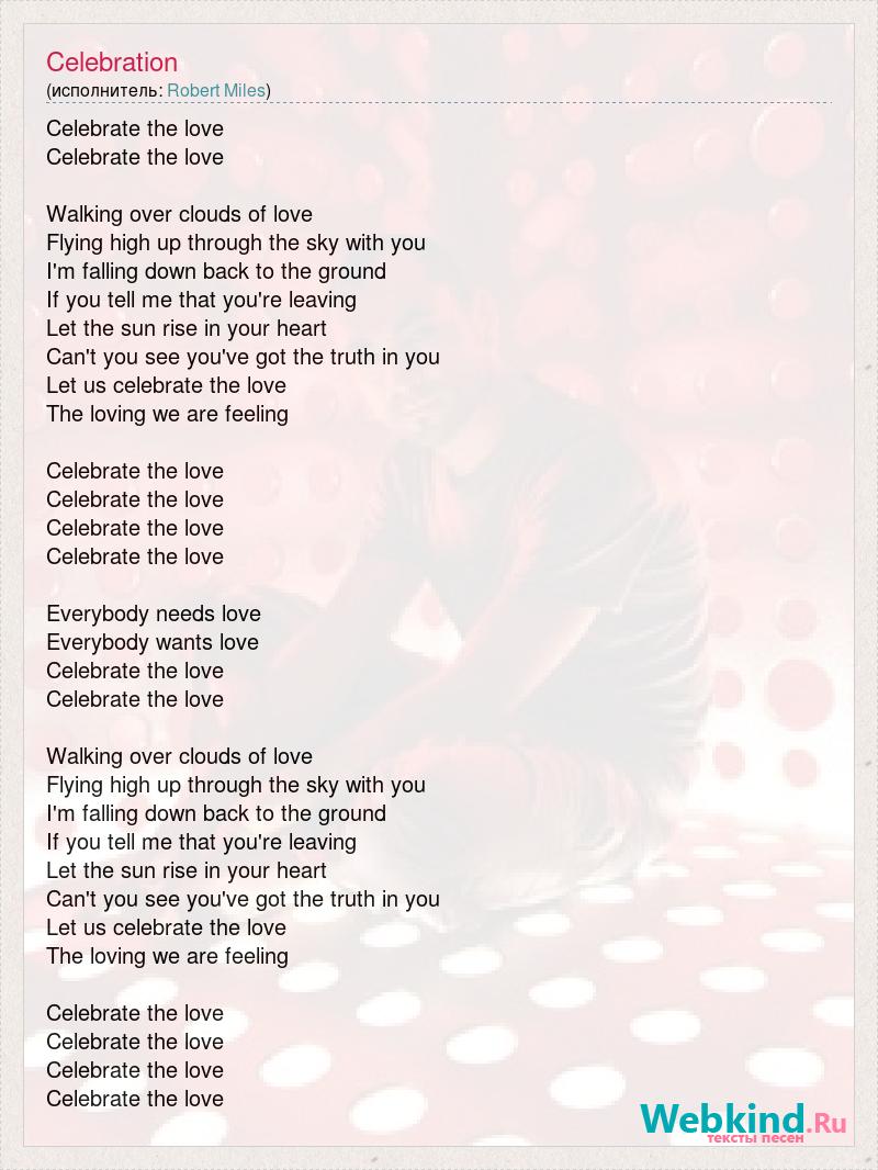 Celebrate the love Celebrate the love Walking over clouds of love Flying high up through the sky with you I'm falling down back to the ground If you tell me that you're leaving Let the sun rise in your heart Can't you see you've got the truth in you Let us celebrate the love The loving we are feeling Celebrate the love Celebrate the love Celebrate the love Celebrate the love Everybody needs love Everybody wants love Celebrate the love Celebrate the love Walking over clouds of love Flying high up through the sky with you I'm falling down back to the ground If you tell me that you're leaving Let the sun rise in your heart Can't you see you've got the truth in you Let us celebrate the love The loving we are feeling Celebrate the love Celebrate the love Celebrate the love Celebrate the love