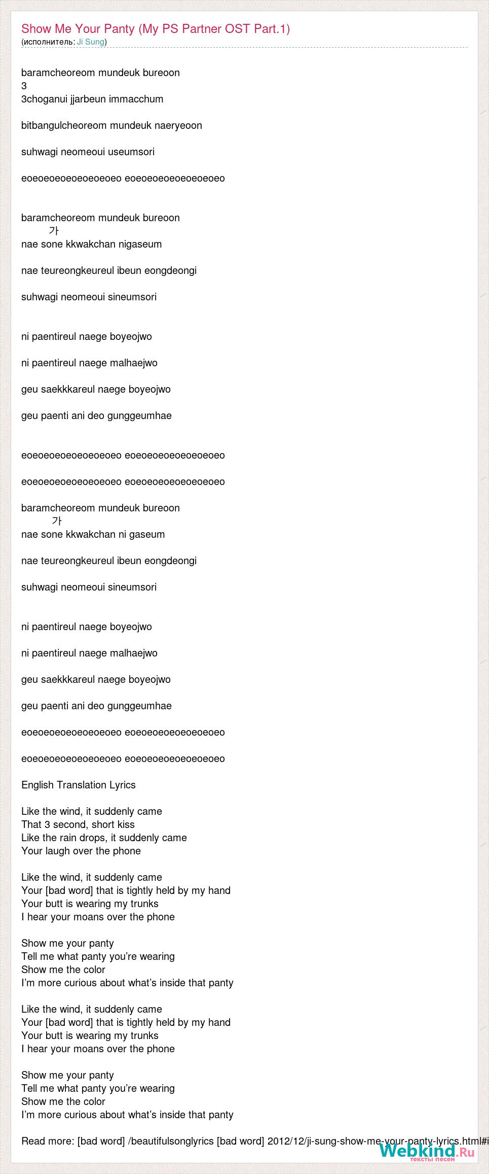 바람처럼 문득 불어온 baramcheoreom mundeuk bureoon 3초간의 짧은 입맟춤 3choganui jjarbeun immacchum 빗방울처럼 문득 내려온 bitbangulcheoreom mundeuk naeryeoon 수화기 너머의 웃음소리 suhwagi neomeoui useumsori 어어어어어어어어어 어어어어어어어어어 eoeoeoeoeoeoeoeoeo eoeoeoeoeoeoeoeoeo 바람처럼 문득 불어온 baramcheoreom mundeuk bureoon 내 손에 꽉찬 니가슴 nae sone kkwakchan nigaseum 내 트렁크를 입은 엉덩이 nae teureongkeureul ibeun eongdeongi 수화기 너머의 신음소리 suhwagi neomeoui sineumsori 니 팬티를 내게 보여줘 ni paentireul naege boyeojwo 니 팬티를 내게 말해줘 ni paentireul naege malhaejwo 그 색깔을 내게 보여줘 geu saekkkareul naege boyeojwo 그 팬티 안이 더 궁금해 geu paenti ani deo gunggeumhae 어어어어어어어어어 어어어어어어어어어 eoeoeoeoeoeoeoeoeo eoeoeoeoeoeoeoeoeo 어어어어어어어어어 어어어어어어어어어 eoeoeoeoeoeoeoeoeo eoeoeoeoeoeoeoeoeo 바람처럼 문득 불어온 baramcheoreom mundeuk bureoon 내 손에 꽉찬 니 가슴 nae sone kkwakchan ni gaseum 내 트렁크를 입은 엉덩이 nae teureongkeureul ibeun eongdeongi 수화기 너머의 신음소리 suhwagi neomeoui sineumsori 니 팬티를 내게 보여줘 ni paentireul naege boyeojwo 니 팬티를 내게 말해줘 ni paentireul naege malhaejwo 그 색깔을 내게 보여줘 geu saekkkareul naege boyeojwo 그 팬티 안이 더 궁금해 geu paenti ani deo gunggeumhae 어어어어어어어어어 어어어어어어어어어 eoeoeoeoeoeoeoeoeo eoeoeoeoeoeoeoeoeo 어어어어어어어어어 어어어어어어어어어 eoeoeoeoeoeoeoeoeo eoeoeoeoeoeoeoeoeo English Translation Lyrics Like the wind, it suddenly came That 3 second, short kiss Like the rain drops, it suddenly came Your laugh over the phone Like the wind, it suddenly came Your [bad word] that is tightly held by my hand Your butt is wearing my trunks I hear your moans over the phone Show me your panty Tell me what panty you’re wearing Show me the color I’m more curious about what’s inside that panty Like the wind, it suddenly came Your [bad word] that is tightly held by my hand Your butt is wearing my trunks I hear your moans over the phone Show me your panty Tell me what panty you’re wearing Show me the color I’m more curious about what’s inside that panty Read more: [bad word] /beautifulsonglyrics [bad word] 2012/12/ji-sung-show-me-your-panty-lyrics.html#i