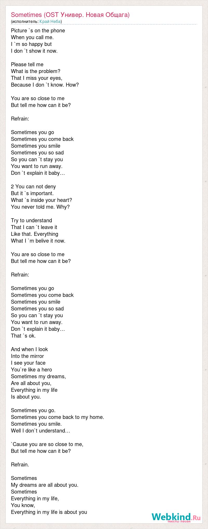 Picture `s on the phone When you call me. I `m so happy but I don `t show it now. Please tell me What is the problem? That I miss your eyes, Because I don `t know. How? You are so close to me But tell me how can it be? Refrain: Sometimes you go Sometimes you come back Sometimes you smile Sometimes you so sad So you can `t stay you You want to run away. Don `t explain it baby… 2 You can not deny But it `s important. What `s inside your heart? You never told me. Why? Try to understand That I can `t leave it Like that. Everything What I `m belive it now. You are so close to me But tell me how can it be? Refrain: Sometimes you go Sometimes you come back Sometimes you smile Sometimes you so sad So you can `t stay you You want to run away. Don `t explain it baby… That `s ok. And when I look Into the mirror I see your face You`re like a hero Sometimes my dreams, Are all about you, Everything in my life Is about you. Sometimes you go. Sometimes you come back to my home. Sometimes you smile. Well I don`t understand… `Cause you are so close to me, But tell me how can it be? Refrain. Sometimes My dreams are all about you. Sometimes Everything in my life, You know, Everything in my life is about you