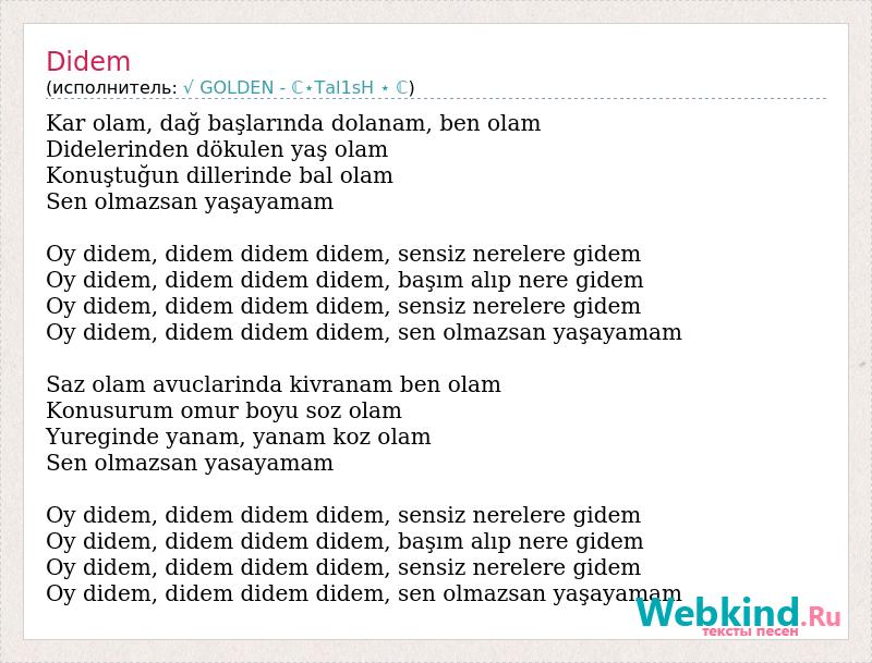 Kar olam, dağ başlarında dolanam, ben olam Didelerinden dökulen yaş olam Konuştuğun dillerinde bal olam Sen olmazsan yaşayamam Oy didem, didem didem didem, sensiz nerelere gidem Oy didem, didem didem didem, başım alıp nere gidem Oy didem, didem didem didem, sensiz nerelere gidem Oy didem, didem didem didem, sen olmazsan yaşayamam Saz olam avuclarinda kivranam ben olam Konusurum omur boyu soz olam Yureginde yanam, yanam koz olam Sen olmazsan yasayamam Oy didem, didem didem didem, sensiz nerelere gidem Oy didem, didem didem didem, başım alıp nere gidem Oy didem, didem didem didem, sensiz nerelere gidem Oy didem, didem didem didem, sen olmazsan yaşayamam