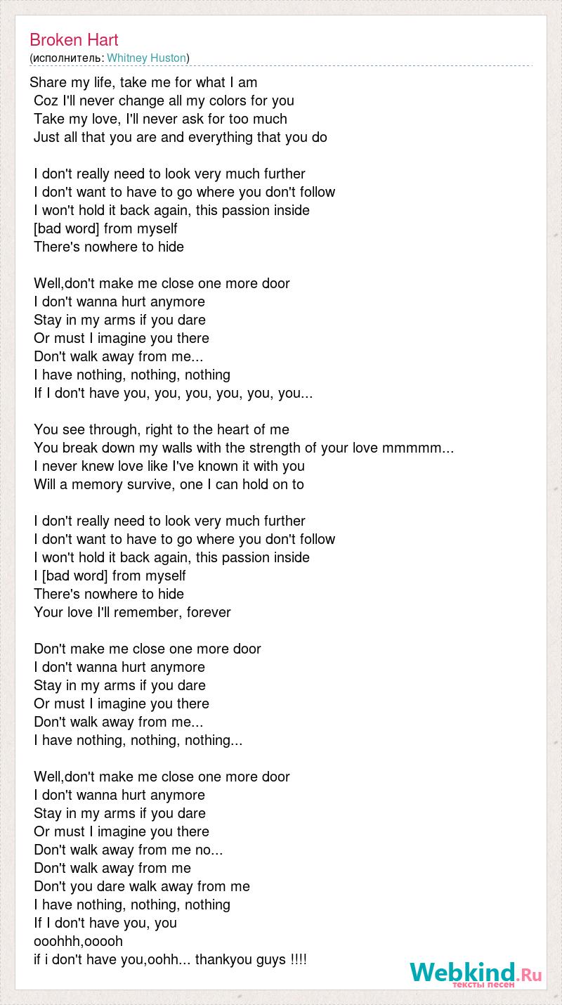 Share my life, take me for what I am Coz I'll never change all my colors for you Take my love, I'll never ask for too much Just all that you are and everything that you do I don't really need to look very much further I don't want to have to go where you don't follow I won't hold it back again, this passion inside [bad word] from myself There's nowhere to hide Well,don't make me close one more door I don't wanna hurt anymore Stay in my arms if you dare Or must I imagine you there Don't walk away from me... I have nothing, nothing, nothing If I don't have you, you, you, you, you, you... You see through, right to the heart of me You break down my walls with the strength of your love mmmmm... I never knew love like I've known it with you Will a memory survive, one I can hold on to I don't really need to look very much further I don't want to have to go where you don't follow I won't hold it back again, this passion inside I [bad word] from myself There's nowhere to hide Your love I'll remember, forever Don't make me close one more door I don't wanna hurt anymore Stay in my arms if you dare Or must I imagine you there Don't walk away from me... I have nothing, nothing, nothing... Well,don't make me close one more door I don't wanna hurt anymore Stay in my arms if you dare Or must I imagine you there Don't walk away from me no... Don't walk away from me Don't you dare walk away from me I have nothing, nothing, nothing If I don't have you, you ooohhh,ooooh if i don't have you,oohh... thankyou guys !!!!