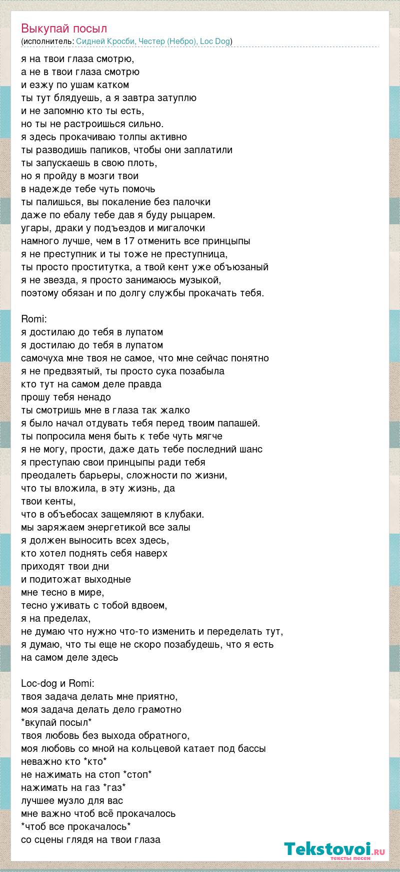 я на твои глаза смотрю, а не в твои глаза смотрю и езжу по ушам катком ты тут блядуешь, а я завтра затуплю и не запомню кто ты есть, но ты не растроишься сильно. я здесь прокачиваю толпы активно ты разводишь папиков, чтобы они заплатили ты запускаешь в свою плоть, но я пройду в мозги твои в надежде тебе чуть помочь ты палишься, вы покаление без палочки даже по ебалу тебе дав я буду рыцарем. угары, драки у подъездов и мигалочки намного лучше, чем в 17 отменить все принцыпы я не преступник и ты тоже не преступница, ты просто проститутка, а твой кент уже объюзаный я не звезда, я просто занимаюсь музыкой, поэтому обязан и по долгу службы прокачать тебя. Romi: я достилаю до тебя в лупатом я достилаю до тебя в лупатом самочуха мне твоя не самое, что мне сейчас понятно я не предвзятый, ты просто сука позабыла кто тут на самом деле правда прошу тебя ненадо ты смотришь мне в глаза так жалко я было начал отдувать тебя перед твоим папашей. ты попросила меня быть к тебе чуть мягче я не могу, прости, даже дать тебе последний шанс я преступаю свои принцыпы ради тебя преодалеть барьеры, сложности по жизни, что ты вложила, в эту жизнь, да твои кенты, что в объебосах защемляют в клубаки. мы заряжаем энергетикой все залы я должен выносить всех здесь, кто хотел поднять себя наверх приходят твои дни и подитожат выходные мне тесно в мире, тесно уживать с тобой вдвоем, я на пределах, не думаю что нужно что-то изменить и переделать тут, я думаю, что ты еще не скоро позабудешь, что я есть на самом деле здесь Loc-dog и Romi: твоя задача делать мне приятно, моя задача делать дело грамотно *вкупай посыл* твоя любовь без выхода обратного, моя любовь со мной на кольцевой катает под бассы неважно кто *кто* не нажимать на стоп *стоп* нажимать на газ *газ* лучшее музло для вас мне важно чтоб всё прокачалось *чтоб все прокачалось* со сцены глядя на твои глаза