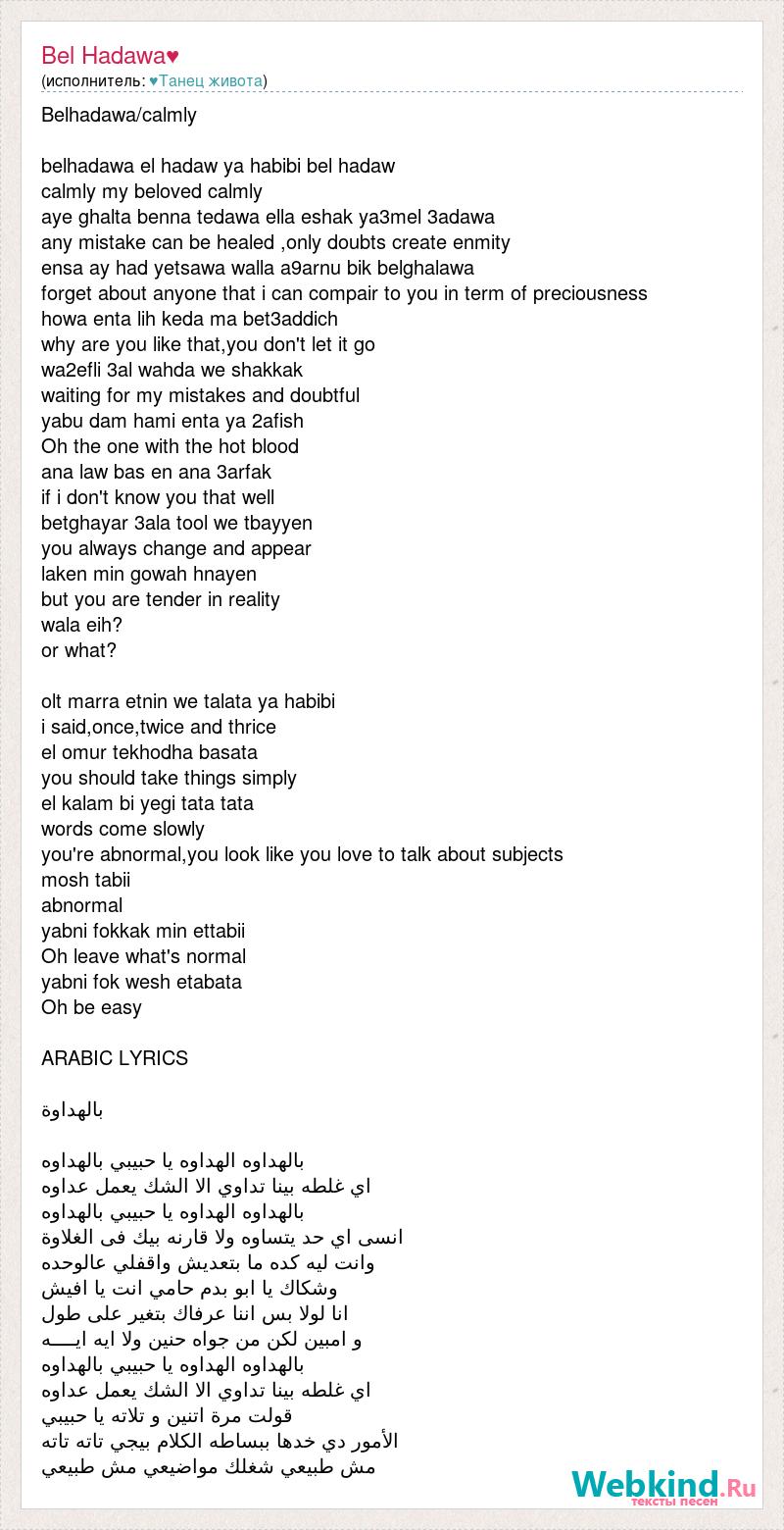Belhadawa/calmly belhadawa el hadaw ya habibi bel hadaw calmly my beloved calmly aye ghalta benna tedawa ella eshak ya3mel 3adawa any mistake can be healed ,only doubts create enmity ensa ay had yetsawa walla a9arnu bik belghalawa forget about anyone that i can compair to you in term of preciousness howa enta lih keda ma bet3addich why are you like that,you don't let it go wa2efli 3al wahda we shakkak waiting for my mistakes and doubtful yabu dam hami enta ya 2afish Oh the one with the hot blood ana law bas en ana 3arfak if i don't know you that well betghayar 3ala tool we tbayyen you always change and appear laken min gowah hnayen but you are tender in reality wala eih? or what? olt marra etnin we talata ya habibi i said,once,twice and thrice el omur tekhodha basata you should take things simply el kalam bi yegi tata tata words come slowly you're abnormal,you look like you love to talk about subjects mosh tabii abnormal yabni fokkak min ettabii Oh leave what's normal yabni fok wesh etabata Oh be easy ARABIC LYRICS بالهداوة بالهداوه الهداوه يا حبيبي بالهداوه اي غلطه بينا تداوي الا الشك يعمل عداوه بالهداوه الهداوه يا حبيبي بالهداوه انسى اي حد يتساوه ولا قارنه بيك فى الغلاوة وانت ليه كده ما بتعديش واقفلي عالوحده وشكاك يا ابو بدم حامي انت يا افيش انا لولا بس اننا عرفاك بتغير على طول و امبين لكن من جواه حنين ولا ايه ايــــه بالهداوه الهداوه يا حبيبي بالهداوه اي غلطه بينا تداوي الا الشك يعمل عداوه قولت مرة اتنين و تلاته يا حبيبي الأمور دي خدها ببساطه الكلام بيجي تاته تاته مش طبيعي شغلك مواضيعي مش طبيعي