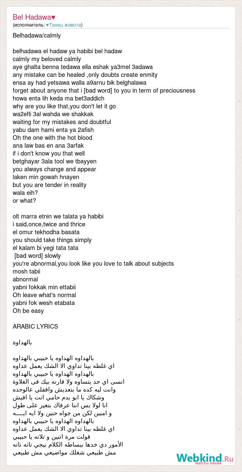 Belhadawa/calmly belhadawa el hadaw ya habibi bel hadaw calmly my beloved calmly aye ghalta benna tedawa ella eshak ya3mel 3adawa any mistake can be healed ,only doubts create enmity ensa ay had yetsawa walla a9arnu bik belghalawa forget about anyone that i [bad word] to you in term of preciousness howa enta lih keda ma bet3addich why are you like that,you don't let it go wa2efli 3al wahda we shakkak waiting for my mistakes and doubtful yabu dam hami enta ya 2afish Oh the one with the hot blood ana law bas en ana 3arfak if i don't know you that well betghayar 3ala tool we tbayyen you always change and appear laken min gowah hnayen but you are tender in reality wala eih? or what? olt marra etnin we talata ya habibi i said,once,twice and thrice el omur tekhodha basata you should take things simply el kalam bi yegi tata tata [bad word] slowly you're abnormal,you look like you love to talk about subjects mosh tabii abnormal yabni fokkak min ettabii Oh leave what's normal yabni fok wesh etabata Oh be easy ARABIC LYRICS بالهداوة بالهداوه الهداوه يا حبيبي بالهداوه اي غلطه بينا تداوي الا الشك يعمل عداوه بالهداوه الهداوه يا حبيبي بالهداوه انسى اي حد يتساوه ولا قارنه بيك فى الغلاوة وانت ليه كده ما بتعديش واقفلي عالوحده وشكاك يا ابو بدم حامي انت يا افيش انا لولا بس اننا عرفاك بتغير على طول و امبين لكن من جواه حنين ولا ايه ايــــه بالهداوه الهداوه يا حبيبي بالهداوه اي غلطه بينا تداوي الا الشك يعمل عداوه قولت مرة اتنين و تلاته يا حبيبي الأمور دي خدها ببساطه الكلام بيجي تاته تاته مش طبيعي شغلك مواضيعي مش طبيعي