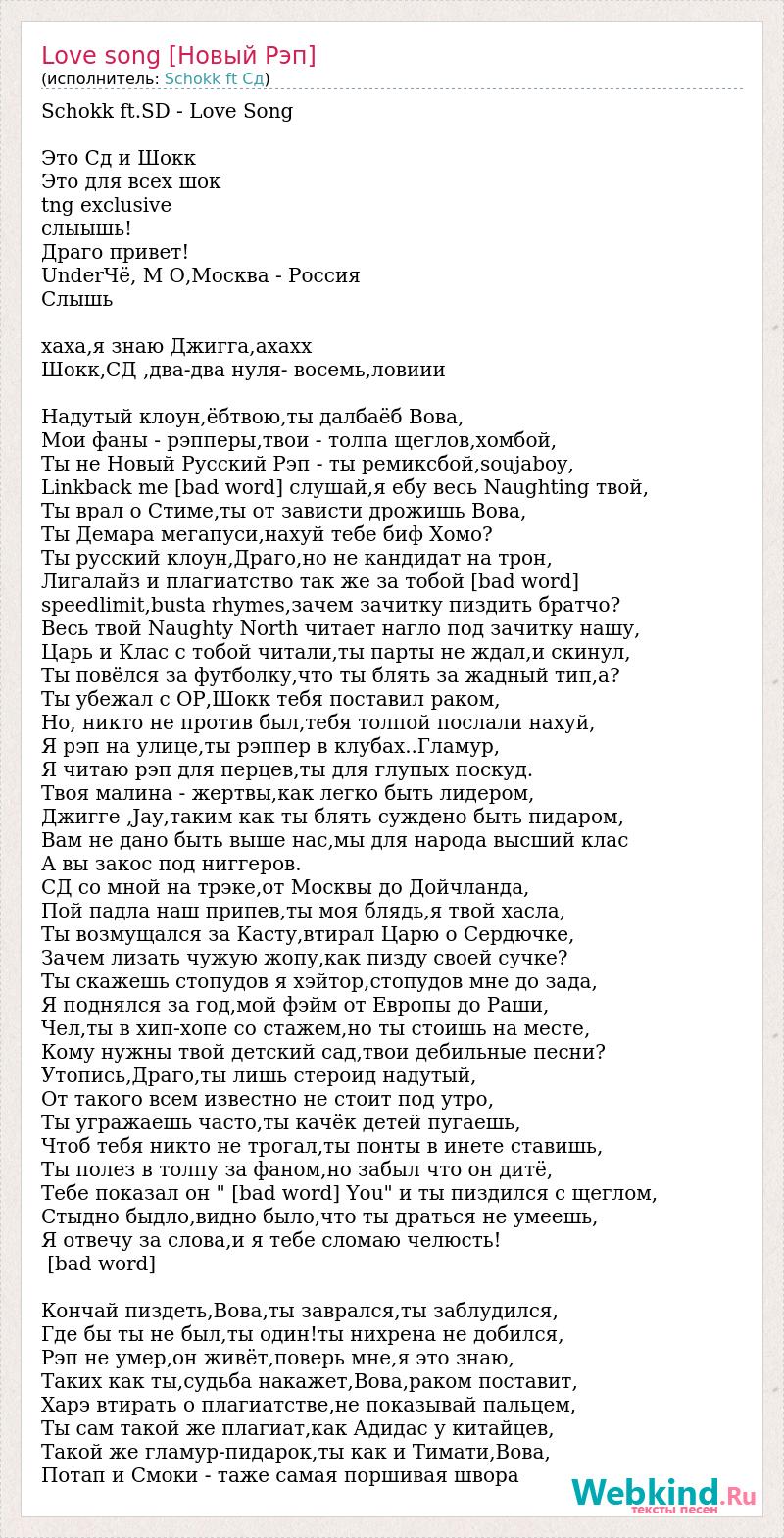 Schokk ft.SD - Love Song Это Сд и Шокк Это для всех шок tng exclusive слыышь! Драго привет! UnderЧё, М О,Москва - Россия Слышь хаха,я знаю Джигга,ахахх Шокк,СД ,два-два нуля- восемь,ловиии Надутый клоун,ёбтвою,ты далбаёб Вова, Мои фаны - рэпперы,твои - толпа щеглов,хомбой, Ты не Новый Русский Рэп - ты ремиксбой,soujaboy, Linkback me [bad word] слушай,я ебу весь Naughting твой, Ты врал о Стиме,ты от зависти дрожишь Вова, Ты Демара мегапуси,нахуй тебе биф Хомо? Ты русский клоун,Драго,но не кандидат на трон, Лигалайз и плагиатство так же за тобой [bad word] speedlimit,busta rhymes,зачем зачитку пиздить братчо? Весь твой Naughty North читает нагло под зачитку нашу, Царь и Клас с тобой читали,ты парты не ждал,и скинул, Ты повёлся за футболку,что ты блять за жадный тип,а? Ты убежал с ОР,Шокк тебя поставил раком, Но, никто не против был,тебя толпой послали нахуй, Я рэп на улице,ты рэппер в клубах..Гламур, Я читаю рэп для перцев,ты для глупых поскуд. Твоя малина - жертвы,как легко быть лидером, Джигге ,Jay,таким как ты блять суждено быть пидаром, Вам не дано быть выше нас,мы для народа высший клас А вы закос под ниггеров. СД со мной на трэке,от Москвы до Дойчланда, Пой падла наш припев,ты моя блядь,я твой хасла, Ты возмущался за Касту,втирал Царю о Сердючке, Зачем лизать чужую жопу,как пизду своей сучке? Ты скажешь стопудов я хэйтор,стопудов мне до зада, Я поднялся за год,мой фэйм от Европы до Раши, Чел,ты в хип-хопе со стажем,но ты стоишь на месте, Кому нужны твой детский сад,твои дебильные песни? Утопись,Драго,ты лишь стероид надутый, От такого всем известно не стоит под утро, Ты угражаешь часто,ты качёк детей пугаешь, Чтоб тебя никто не трогал,ты понты в инете ставишь, Ты полез в толпу за фаном,но забыл что он дитё, Тебе показал он " [bad word] You" и ты пиздился с щеглом, Стыдно быдло,видно было,что ты драться не умеешь, Я отвечу за слова,и я тебе сломаю челюсть! [bad word] Кончай пиздеть,Вова,ты заврался,ты заблудился, Где бы ты не был,ты один!ты нихрена не добился, Рэп не умер,он живёт,поверь мне,я это знаю, Таких как ты,судьба накажет,Вова,раком поставит, Харэ втирать о плагиатстве,не показывай пальцем, Ты сам такой же плагиат,как Адидас у китайцев, Такой же гламур-пидарок,ты как и Тимати,Вова, Потап и Смоки - таже самая поршивая швора