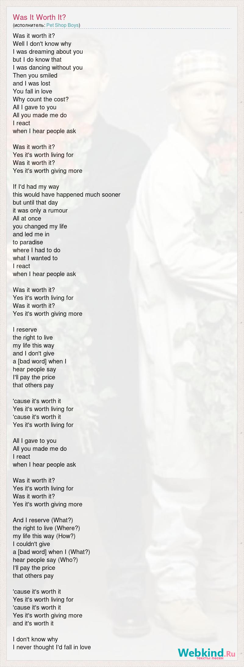 Was it worth it? Well I don't know why I was dreaming about you but I do know that I was dancing without you Then you smiled and I was lost You fall in love Why count the cost? All I gave to you All you made me do I react when I hear people ask Was it worth it? Yes it's worth living for Was it worth it? Yes it's worth giving more If I'd had my way this would have happened much sooner but until that day it was only a rumour All at once you changed my life and led me in to paradise where I had to do what I wanted to I react when I hear people ask Was it worth it? Yes it's worth living for Was it worth it? Yes it's worth giving more I reserve the right to live my life this way and I don't give a [bad word] when I hear people say I'll pay the price that others pay 'cause it's worth it Yes it's worth living for 'cause it's worth it Yes it's worth living for All I gave to you All you made me do I react when I hear people ask Was it worth it? Yes it's worth living for Was it worth it? Yes it's worth giving more And I reserve (What?) the right to live (Where?) my life this way (How?) I couldn't give a [bad word] when I (What?) hear people say (Who?) I'll pay the price that others pay 'cause it's worth it Yes it's worth living for 'cause it's worth it Yes it's worth giving more and it's worth it I don't know why I never thought I'd fall in love
