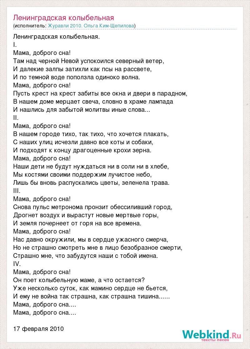 Ленинградская колыбельная. I. Мама, доброго сна! Там над черной Невой успокоился северный ветер, И далекие залпы затихли как псы на рассвете, И по темной воде поползла одиноко волна. Мама, доброго сна! Пусть крест на крест забиты все окна и двери в парадном, В нашем доме мерцает свеча, словно в храме лампада И нашлись для забытой молитвы иные слова... II. Мама, доброго сна! В нашем городе тихо, так тихо, что хочется плакать, С наших улиц исчезли давно все коты и собаки, И подходят к концу драгоценные крохи зерна. Мама, доброго сна! Наши дети не будут нуждаться ни в соли ни в хлебе, Мы костями своими поддержим лучистое небо, Лишь бы вновь распускались цветы, зеленела трава. III. Мама, доброго сна! Снова пульс метронома пронзит обессиливший город, Дрогнет воздух и вырастут новые мертвые горы, И земля почернеет от горя на все времена. Мама, доброго сна! Нас давно окружили, мы в сердце ужасного смерча, Но не страшно смотреть мне в лицо безобразное смерти, Страшно мне, что забудутся наши с тобой имена. IV. Мама, доброго сна! Он поет колыбельную маме, а что остается? Уже несколько суток, как мамино сердце не бьется, И ему не война так страшна, как страшна тишина...... Мама, доброго сна.... Мама, доброго сна.... 17 февраля 2010