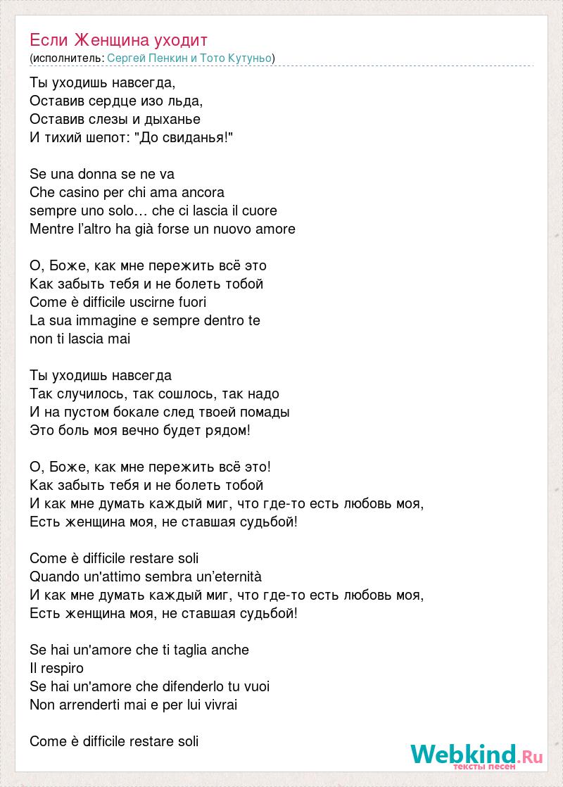 Ты уходишь навсегда, Оставив сердце изо льда, Оставив слезы и дыханье И тихий шепот: "До свиданья!" Se una donna se ne va Che casino per chi ama ancora sempre uno solo… che ci lascia il cuore Mentre l’altro ha già forse un nuovo amore О, Боже, как мне пережить всё это Как забыть тебя и не болеть тобой Come è difficile uscirne fuori La sua immagine e sempre dentro te non ti lascia mai Ты уходишь навсегда Так случилось, так сошлось, так надо И на пустом бокале след твоей помады Это боль моя вечно будет рядом! О, Боже, как мне пережить всё это! Как забыть тебя и не болеть тобой И как мне думать каждый миг, что где-то есть любовь моя, Есть женщина моя, не ставшая судьбой! Come è difficile restare soli Quando un'attimo sembra un’eternità И как мне думать каждый миг, что где-то есть любовь моя, Есть женщина моя, не ставшая судьбой! Se hai un'amore che ti taglia anche Il respiro Se hai un'amore che difenderlo tu vuoi Non arrenderti mai e per lui vivrai Come è difficile restare soli
