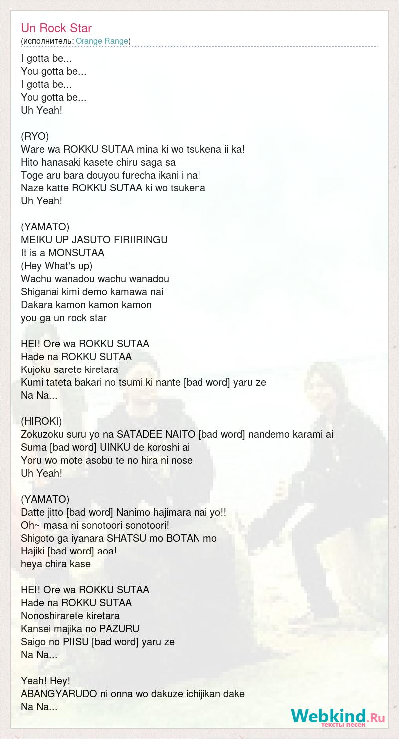 I gotta be... You gotta be... I gotta be... You gotta be... Uh Yeah! (RYO) Ware wa ROKKU SUTAA mina ki wo tsukena ii ka! Hito hanasaki kasete chiru saga sa Toge aru bara douyou furecha ikani i na! Naze katte ROKKU SUTAA ki wo tsukena Uh Yeah! (YAMATO) MEIKU UP JASUTO FIRIIRINGU It is a MONSUTAA (Hey What's up) Wachu wanadou wachu wanadou Shiganai kimi demo kamawa nai Dakara kamon kamon kamon you ga un rock star HEI! Ore wa ROKKU SUTAA Hade na ROKKU SUTAA Kujoku sarete kiretara Kumi tateta bakari no tsumi ki nante [bad word] yaru ze Na Na... (HIROKI) Zokuzoku suru yo na SATADEE NAITO [bad word] nandemo karami ai Suma [bad word] UINKU de koroshi ai Yoru wo mote asobu te no hira ni nose Uh Yeah! (YAMATO) Datte jitto [bad word] Nanimo hajimara nai yo!! Oh~ masa ni sonotoori sonotoori! Shigoto ga iyanara SHATSU mo BOTAN mo Hajiki [bad word] aoa! heya chira kase HEI! Ore wa ROKKU SUTAA Hade na ROKKU SUTAA Nonoshirarete kiretara Kansei majika no PAZURU Saigo no PIISU [bad word] yaru ze Na Na... Yeah! Hey! ABANGYARUDO ni onna wo dakuze ichijikan dake Na Na...