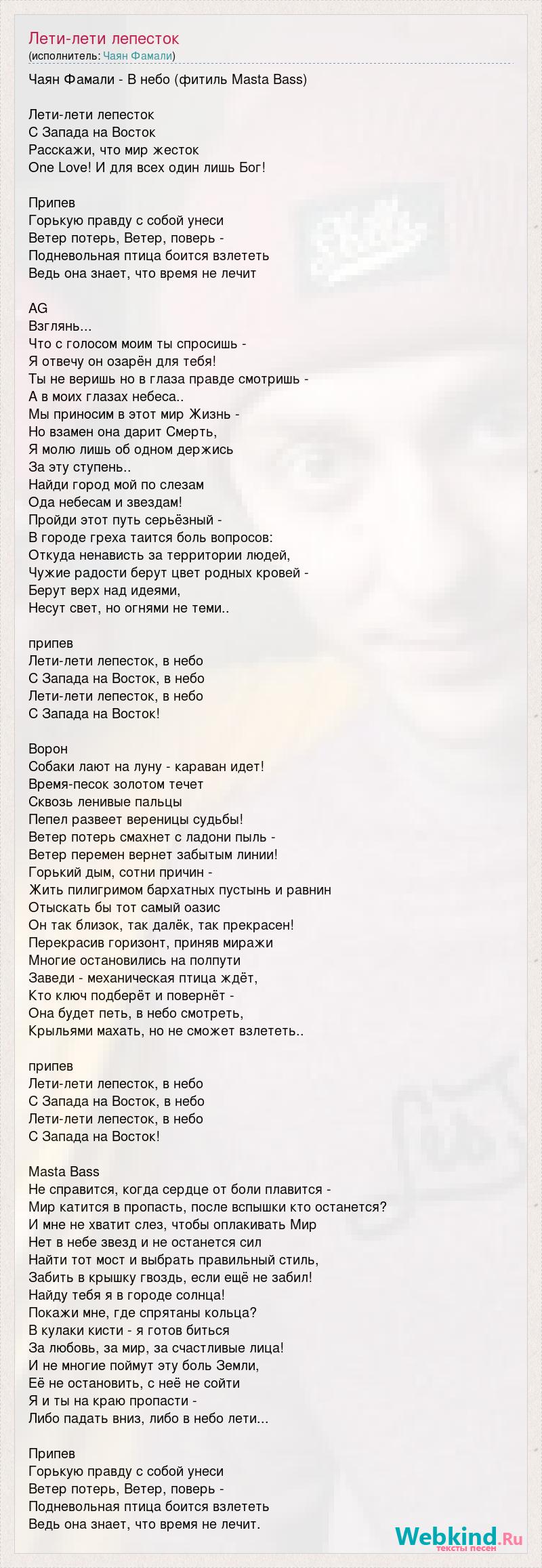 Чаян Фамали - В небо (фитиль Masta Bass) Лети-лети лепесток С Запада на Восток Расскажи, что мир жесток One Love! И для всех один лишь Бог! Припев Горькую правду с собой унеси Ветер потерь, Ветер, поверь - Подневольная птица боится взлететь Ведь она знает, что время не лечит AG Взглянь... Что с голосом моим ты спросишь - Я отвечу он озарён для тебя! Ты не веришь но в глаза правде смотришь - А в моих глазах небеса.. Мы приносим в этот мир Жизнь - Но взамен она дарит Смерть, Я молю лишь об одном держись За эту ступень.. Найди город мой по слезам Ода небесам и звездам! Пройди этот путь серьёзный - В городе греха таится боль вопросов: Откуда ненависть за территории людей, Чужие радости берут цвет родных кровей - Берут верх над идеями, Несут свет, но огнями не теми.. припев Лети-лети лепесток, в небо С Запада на Восток, в небо Лети-лети лепесток, в небо С Запада на Восток! Ворон Собаки лают на луну - караван идет! Время-песок золотом течет Сквозь ленивые пальцы Пепел развеет вереницы судьбы! Ветер потерь смахнет с ладони пыль - Ветер перемен вернет забытым линии! Горький дым, сотни причин - Жить пилигримом бархатных пустынь и равнин Отыскать бы тот самый оазис Он так близок, так далёк, так прекрасен! Перекрасив горизонт, приняв миражи Многие остановились на полпути Заведи - механическая птица ждёт, Кто ключ подберёт и повернёт - Она будет петь, в небо смотреть, Крыльями махать, но не сможет взлететь.. припев Лети-лети лепесток, в небо С Запада на Восток, в небо Лети-лети лепесток, в небо С Запада на Восток! Masta Bass Не справится, когда сердце от боли плавится - Мир катится в пропасть, после вспышки кто останется? И мне не хватит слез, чтобы оплакивать Мир Нет в небе звезд и не останется сил Найти тот мост и выбрать правильный стиль, Забить в крышку гвоздь, если ещё не забил! Найду тебя я в городе солнца! Покажи мне, где спрятаны кольца? В кулаки кисти - я готов биться За любовь, за мир, за счастливые лица! И не многие поймут эту боль Земли, Её не остановить, с неё не сойти Я и ты на краю пропасти - Либо падать вниз, либо в небо лети... Припев Горькую правду с собой унеси Ветер потерь, Ветер, поверь - Подневольная птица боится взлететь Ведь она знает, что время не лечит.