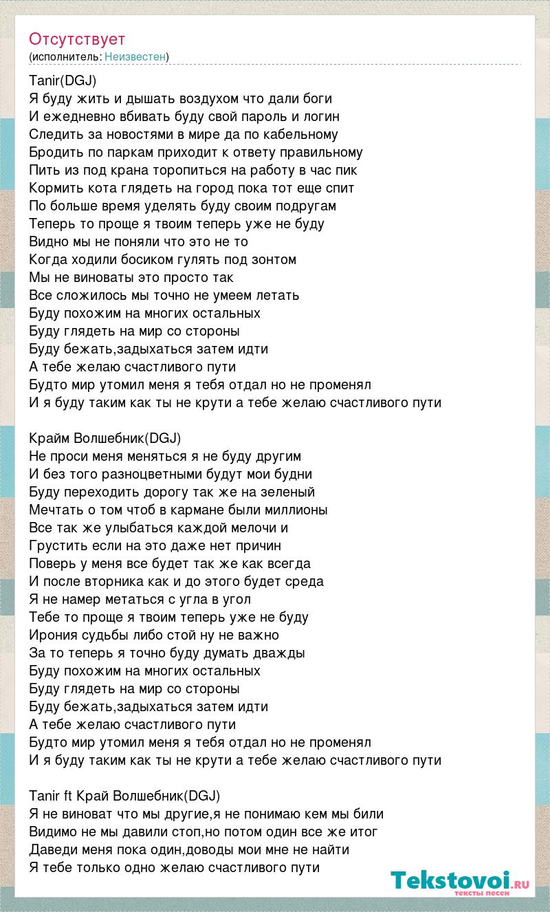 Tanir(DGJ) Я буду жить и дышать воздухом что дали боги И ежедневно вбивать буду свой пароль и логин Следить за новостями в мире да по кабельному Бродить по паркам приходит к ответу правильному Пить из под крана торопиться на работу в час пик Кормить кота глядеть на город пока тот еще спит По больше время уделять буду своим подругам Теперь то проще я твоим теперь уже не буду Видно мы не поняли что это не то Когда ходили босиком гулять под зонтом Мы не виноваты это просто так Все сложилось мы точно не умеем летать Буду похожим на многих остальных Буду глядеть на мир со стороны Буду бежать,задыхаться затем идти А тебе желаю счастливого пути Будто мир утомил меня я тебя отдал но не променял И я буду таким как ты не крути а тебе желаю счастливого пути Крайм Волшебник(DGJ) Не проси меня меняться я не буду другим И без того разноцветными будут мои будни Буду переходить дорогу так же на зеленый Мечтать о том чтоб в кармане были миллионы Все так же улыбаться каждой мелочи и Грустить если на это даже нет причин Поверь у меня все будет так же как всегда И после вторника как и до этого будет среда Я не намер метаться с угла в угол Тебе то проще я твоим теперь уже не буду Ирония судьбы либо стой ну не важно За то теперь я точно буду думать дважды Буду похожим на многих остальных Буду глядеть на мир со стороны Буду бежать,задыхаться затем идти А тебе желаю счастливого пути Будто мир утомил меня я тебя отдал но не променял И я буду таким как ты не крути а тебе желаю счастливого пути Tanir ft Край Волшебник(DGJ) Я не виноват что мы другие,я не понимаю кем мы били Видимо не мы давили стоп,но потом один все же итог Даведи меня пока один,доводы мои мне не найти Я тебе только одно желаю счастливого пути