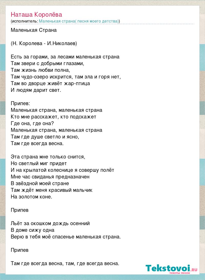 Маленькая Страна (Н. Королева - И.Николаев) Есть за горами, за лесами маленькая страна Там звери с добрыми глазами, Там жизнь любви полна, Там чудо-озеро искрится, там зла и горя нет, Там во дворце живёт жар-птица И людям дарит свет. Припев: Маленькая страна, маленькая страна Кто мне расскажет, кто подскажет Где она, где она? Маленькая страна, маленькая страна Там где душе светло и ясно, Там где всегда весна. Эта страна мне только снится, Но светлый миг придет И на крылатой колеснице я совершу полёт Мне час свиданья предназначен В звёздной моей стране Там ждёт меня красивый мальчик На золотом коне. Припев Льёт за окошком дождь осенний В доме сижу одна Верю в тебя моё спасенье маленькая страна. Припев Там где всегда весна, там, где всегда весна.