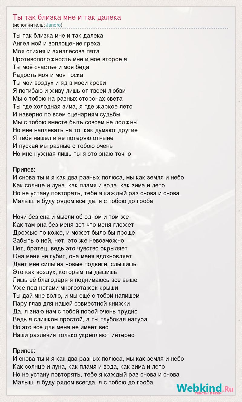 Ты так близка мне и так далека Ангел мой и воплощение греха Моя стихия и ахиллесова пята Противоположность мне и моё второе я Ты моё счастье и моя беда Радость моя и моя тоска Ты мой воздух и яд в моей крови Я погибаю и живу лишь от твоей любви Мы с тобою на разных сторонах света Ты где холодная зима, я где жаркое лето И наверно по всем сценариям судьбы Мы с тобою вместе быть совсем не должны Но мне наплевать на то, как думают другие Я тебя нашел и не потеряю отныне И пускай мы разные с тобою очень Но мне нужная лишь ты я это знаю точно Припев: И снова ты и я как два разных полюса, мы как земля и небо Как солнце и луна, как пламя и вода, как зима и лето Но не устану повторять, тебе я каждый раз снова и снова Малыш, я буду рядом всегда, я с тобою до гроба Ночи без сна и мысли об одном и том же Как там она без меня вот что меня гложет Дрожью по коже, и может было бы проще Забыть о ней, нет, это же невозможно Нет, братец, ведь это чувство окрыляет Она меня не губит, она меня вдохновляет Дает мне силы на новые подвиги, слышишь Это как воздух, которым ты дышишь Лишь её благодаря я поднимаюсь все выше Уже под ногами многоэтажек крыши Ты дай мне волю, и мы ещё с тобой напишем Пару глав для нашей совместной книжки Да, я знаю нам с тобой порой очень трудно Ведь я слишком простой, а ты глубокая натура Но это все для меня не имеет вес Наши различия только укрепляют интерес Припев: И снова ты и я как два разных полюса, мы как земля и небо Как солнце и луна, как пламя и вода, как зима и лето Но не устану повторять, тебе я каждый раз снова и снова Малыш, я буду рядом всегда, я с тобою до гроба