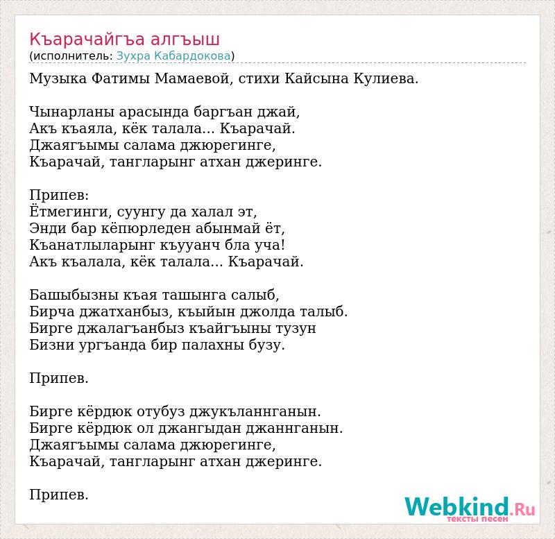 Музыка Фатимы Мамаевой, стихи Кайсына Кулиева. Чынарланы арасында баргъан джай, Акъ къаяла, кёк талала... Къарачай. Джаягъымы салама джюрегинге, Къарачай, тангларынг атхан джеринге. Припев: Ётмегинги, суунгу да халал эт, Энди бар кёпюрледен абынмай ёт, Къанатлыларынг къууанч бла уча! Акъ къалала, кёк талала... Къарачай. Башыбызны къая ташынга салыб, Бирча джатханбыз, къыйын джолда талыб. Бирге джалагъанбыз къайгъыны тузун Бизни ургъанда бир палахны бузу. Припев. Бирге кёрдюк отубуз джукъланнганын. Бирге кёрдюк ол джангыдан джаннганын. Джаягъымы салама джюрегинге, Къарачай, тангларынг атхан джеринге. Припев.