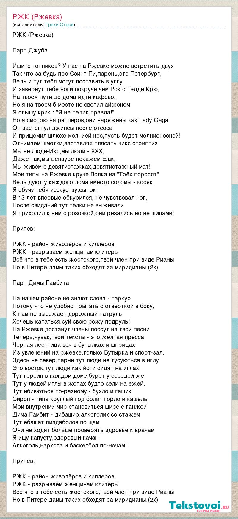 РЖК (Ржевка) Парт Джуба Ищите гопников? У нас на Ржевке можно встретить двух Так что за будь про Сэйнт Пи,парень,это Петербург, Ведь и тут тебя могут поставить в углу И завернут тебе ноги покруче чем Рок с Тэдди Крю, На твоем пути до дома идти кафово, Но я на твоем б месте не светил айфоном Я слышу крик : "Я не педик,правда!" Но я смотрю на рэпперов,они наряжены как Lady Gaga Он застегнул джинсы после отсоса И прищемил шлюхе молнией нос,пусть будет молниеносной! Отнимаем шмотки,заставляя плясать чикс стриптиз Мы не Люди-Икс,мы люди - ХХХ, Даже так,мы цензуре покажем фак, Мы живём с девятиэтажках,девятиэтажный мат! Мои типы на Ржевке круче Волка из "Трёх поросят" Ведь дуют у каждого дома вместо соломы - косяк Я обучу тебя исскуству,сынок В 13 лет впервые обкурился, не чувствовал ног, После свиданий тут тёлки не выживали Я приходил к ним с розочкой,они резались но не шипами! Припев: РЖК - район живодёров и киллеров, РЖК - разрываем женщинам клитеры Всё что в тебе есть жостокого,твой член при виде Рианы Но в Питере дамы таких обходят за миридианы.(2х) Парт Димы Гамбита На нашем районе не знают слова - паркур Потому что не удобно прыгать с отвёрткой в боку, К нам не выезжает дорожный патруль Хочешь кататься,суй свою рожу подруль! На Ржевке достанут члены,поссут на твои песни Теперь,чувак,твои тексты - это желтая пресса Черная лестница вся в бутылках и шприцах Из увлечений на ржевке,только Бутырка и спорт-зал, Здесь не север,парни,тут люди не тусуються в иглу Это восток,тут люди как йоги сидят на иглах Тут героин в каждом доме бурет у соседей же Тут у людей иглы в жопах будто сели на ежей, Тут ибивються по-разному - бухло и гашик Сироп - типа круглый год болит горло и кашель, Мой внутрений мир становиться шире с ганжей Дима Гамбит - дибашир,алкоголик со стажем Тут ебашат пиздаболов по щам Они не ходят больше проверять здровье к врачам Я ищу капусту,здоровый качан Алкоголь,наркота и баскетбол по-ночам! Припев: РЖК - район живодёров и киллеров, РЖК - разрываем женщинам клитеры Всё что в тебе есть жостокого,твой член при виде Рианы Но в Питере дамы таких обходят за миридианы.(2х)
