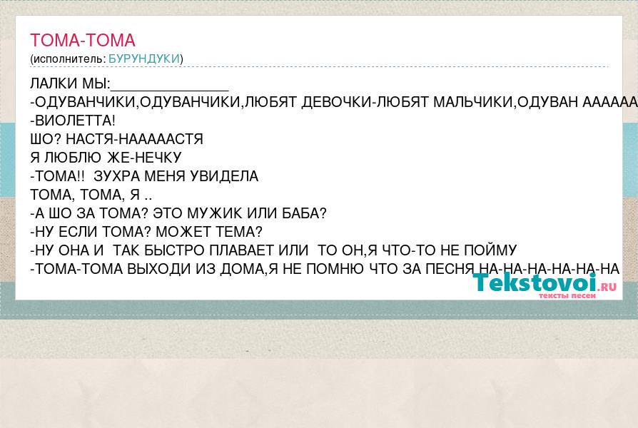 ЛАЛКИ МЫ:_______________ -ОДУВАНЧИКИ,ОДУВАНЧИКИ,ЛЮБЯТ ДЕВОЧКИ-ЛЮБЯТ МАЛЬЧИКИ,ОДУВАН АААААА -ВИОЛЕТТА! ШО? НАСТЯ-НАААААСТЯ Я ЛЮБЛЮ ЖЕ-НЕЧКУ -ТОМА!! ЗУХРА МЕНЯ УВИДЕЛА ТОМА, ТОМА, Я .. -А ШО ЗА ТОМА? ЭТО МУЖИК ИЛИ БАБА? -НУ ЕСЛИ ТОМА? МОЖЕТ ТЕМА? -НУ ОНА И ТАК БЫСТРО ПЛАВАЕТ ИЛИ ТО ОН,Я ЧТО-ТО НЕ ПОЙМУ -ТОМА-ТОМА ВЫХОДИ ИЗ ДОМА,Я НЕ ПОМНЮ ЧТО ЗА ПЕСНЯ НА-НА-НА-НА-НА-НА