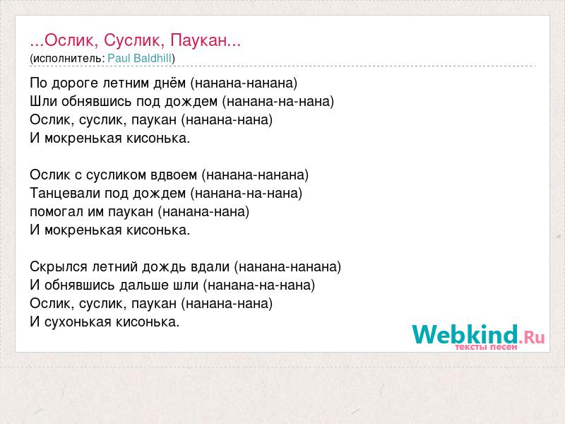 По дороге летним днём (нанана-нанана) Шли обнявшись под дождем (нанана-на-нана) Ослик, суслик, паукан (нанана-нана) И мокренькая кисонька. Ослик с сусликом вдвоем (нанана-нанана) Танцевали под дождем (нанана-на-нана) помогал им паукан (нанана-нана) И мокренькая кисонька. Скрылся летний дождь вдали (нанана-нанана) И обнявшись дальше шли (нанана-на-нана) Ослик, суслик, паукан (нанана-нана) И сухонькая кисонька.
