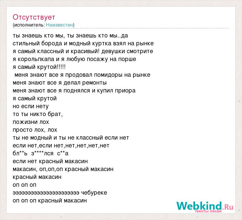 ты знаешь кто мы, ты знаешь кто мы..да стильный борода и модный куртка взял на рынке я самый классный и красивый! девушки смотрите я корольпкапа и я любую посажу на порше я самый крутой!!!!! меня знают все я продовал помидоры на рынке меня знают все я делал ремонты меня знают все я поднялся и купил приора я самый крутой но если нету то ты никто брат, пожизни лох просто лох, лох ты не модный и ты не классный если нет если нет,если нет,нет,нет,нет,нет бл**ь з****лся с**а если нет красный макасин макасин, оп,оп,оп красный макасин красный макасин оп оп оп ээээээээээээээээээээээ чебуреке оп оп оп красный макасин