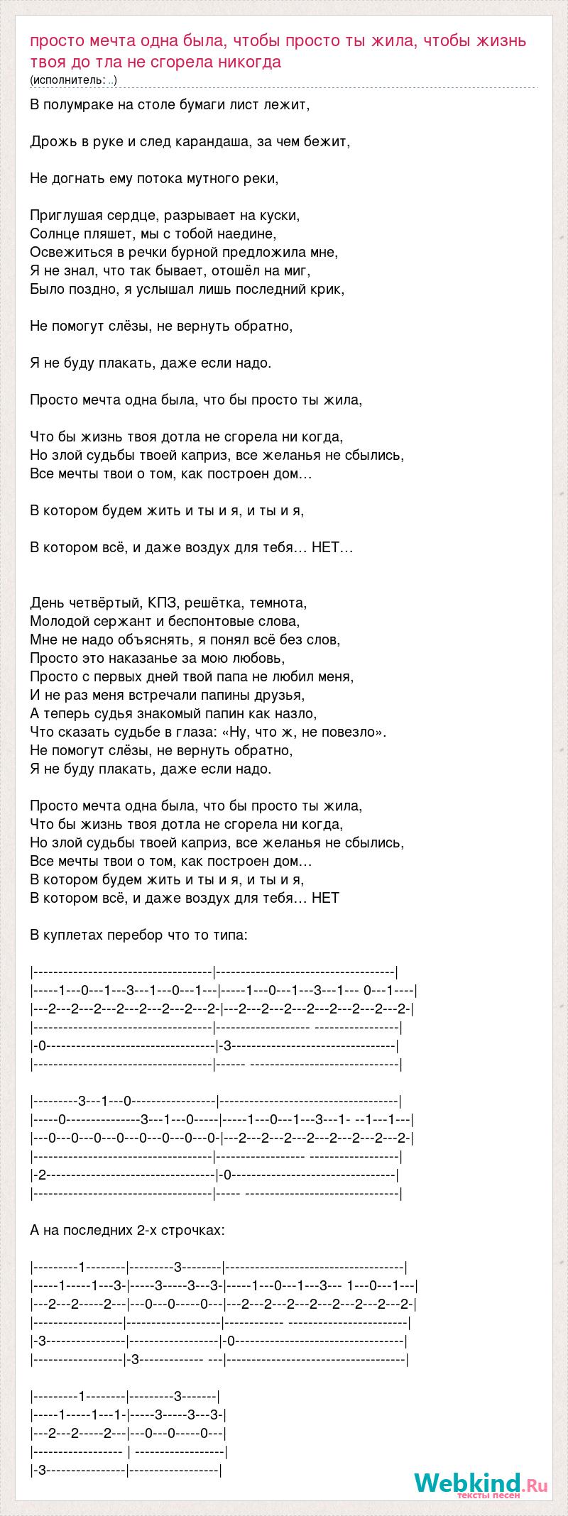 В полумраке на столе бумаги лист лежит, Дрожь в руке и след карандаша, за чем бежит, Не догнать ему потока мутного реки, Приглушая сердце, разрывает на куски, Солнце пляшет, мы с тобой наедине, Освежиться в речки бурной предложила мне, Я не знал, что так бывает, отошёл на миг, Было поздно, я услышал лишь последний крик, Не помогут слёзы, не вернуть обратно, Я не буду плакать, даже если надо. Просто мечта одна была, что бы просто ты жила, Что бы жизнь твоя дотла не сгорела ни когда, Но злой судьбы твоей каприз, все желанья не сбылись, Все мечты твои о том, как построен дом… В котором будем жить и ты и я, и ты и я, В котором всё, и даже воздух для тебя… НЕТ… День четвёртый, КПЗ, решётка, темнота, Молодой сержант и беспонтовые слова, Мне не надо объяснять, я понял всё без слов, Просто это наказанье за мою любовь, Просто с первых дней твой папа не любил меня, И не раз меня встречали папины друзья, А теперь судья знакомый папин как назло, Что сказать судьбе в глаза: «Ну, что ж, не повезло». Не помогут слёзы, не вернуть обратно, Я не буду плакать, даже если надо. Просто мечта одна была, что бы просто ты жила, Что бы жизнь твоя дотла не сгорела ни когда, Но злой судьбы твоей каприз, все желанья не сбылись, Все мечты твои о том, как построен дом… В котором будем жить и ты и я, и ты и я, В котором всё, и даже воздух для тебя… НЕТ В куплетах перебор что то типа: |------------------------------------|------------------------------------| |-----1---0---1---3---1---0---1---|-----1---0---1---3---1--- 0---1----| |---2---2---2---2---2---2---2---2-|---2---2---2---2---2---2---2---2-| |------------------------------------|------------------- -----------------| |-0----------------------------------|-3---------------------------------| |------------------------------------|------ ------------------------------| |---------3---1---0-----------------|------------------------------------| |-----0---------------3---1---0-----|-----1---0---1---3---1- --1---1---| |---0---0---0---0---0---0---0---0-|---2---2---2---2---2---2---2---2-| |------------------------------------|------------------ ------------------| |-2----------------------------------|-0---------------------------------| |------------------------------------|----- -------------------------------| А на последних 2-х строчках: |---------1--------|---------3--------|------------------------------------| |-----1-----1---3-|-----3-----3---3-|-----1---0---1---3--- 1---0---1---| |---2---2-----2---|---0---0-----0---|---2---2---2---2---2---2---2---2-| |------------------|-------------------|------------ ------------------------| |-3----------------|------------------|-0----------------------------------| |------------------|-3------------- ---|------------------------------------| |---------1--------|---------3-------| |-----1-----1---1-|-----3-----3---3-| |---2---2-----2---|---0---0-----0---| |------------------ | ------------------| |-3----------------|------------------|