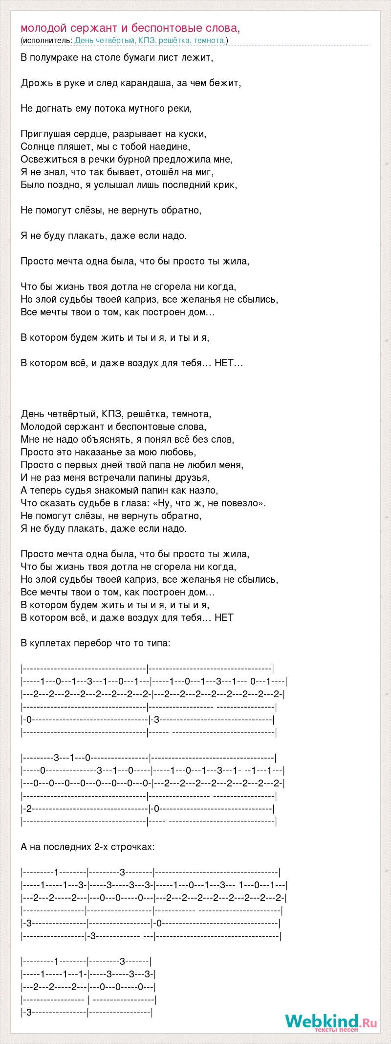 В полумраке на столе бумаги лист лежит, Дрожь в руке и след карандаша, за чем бежит, Не догнать ему потока мутного реки, Приглушая сердце, разрывает на куски, Солнце пляшет, мы с тобой наедине, Освежиться в речки бурной предложила мне, Я не знал, что так бывает, отошёл на миг, Было поздно, я услышал лишь последний крик, Не помогут слёзы, не вернуть обратно, Я не буду плакать, даже если надо. Просто мечта одна была, что бы просто ты жила, Что бы жизнь твоя дотла не сгорела ни когда, Но злой судьбы твоей каприз, все желанья не сбылись, Все мечты твои о том, как построен дом… В котором будем жить и ты и я, и ты и я, В котором всё, и даже воздух для тебя… НЕТ… День четвёртый, КПЗ, решётка, темнота, Молодой сержант и беспонтовые слова, Мне не надо объяснять, я понял всё без слов, Просто это наказанье за мою любовь, Просто с первых дней твой папа не любил меня, И не раз меня встречали папины друзья, А теперь судья знакомый папин как назло, Что сказать судьбе в глаза: «Ну, что ж, не повезло». Не помогут слёзы, не вернуть обратно, Я не буду плакать, даже если надо. Просто мечта одна была, что бы просто ты жила, Что бы жизнь твоя дотла не сгорела ни когда, Но злой судьбы твоей каприз, все желанья не сбылись, Все мечты твои о том, как построен дом… В котором будем жить и ты и я, и ты и я, В котором всё, и даже воздух для тебя… НЕТ В куплетах перебор что то типа: |------------------------------------|------------------------------------| |-----1---0---1---3---1---0---1---|-----1---0---1---3---1--- 0---1----| |---2---2---2---2---2---2---2---2-|---2---2---2---2---2---2---2---2-| |------------------------------------|------------------- -----------------| |-0----------------------------------|-3---------------------------------| |------------------------------------|------ ------------------------------| |---------3---1---0-----------------|------------------------------------| |-----0---------------3---1---0-----|-----1---0---1---3---1- --1---1---| |---0---0---0---0---0---0---0---0-|---2---2---2---2---2---2---2---2-| |------------------------------------|------------------ ------------------| |-2----------------------------------|-0---------------------------------| |------------------------------------|----- -------------------------------| А на последних 2-х строчках: |---------1--------|---------3--------|------------------------------------| |-----1-----1---3-|-----3-----3---3-|-----1---0---1---3--- 1---0---1---| |---2---2-----2---|---0---0-----0---|---2---2---2---2---2---2---2---2-| |------------------|-------------------|------------ ------------------------| |-3----------------|------------------|-0----------------------------------| |------------------|-3------------- ---|------------------------------------| |---------1--------|---------3-------| |-----1-----1---1-|-----3-----3---3-| |---2---2-----2---|---0---0-----0---| |------------------ | ------------------| |-3----------------|------------------|