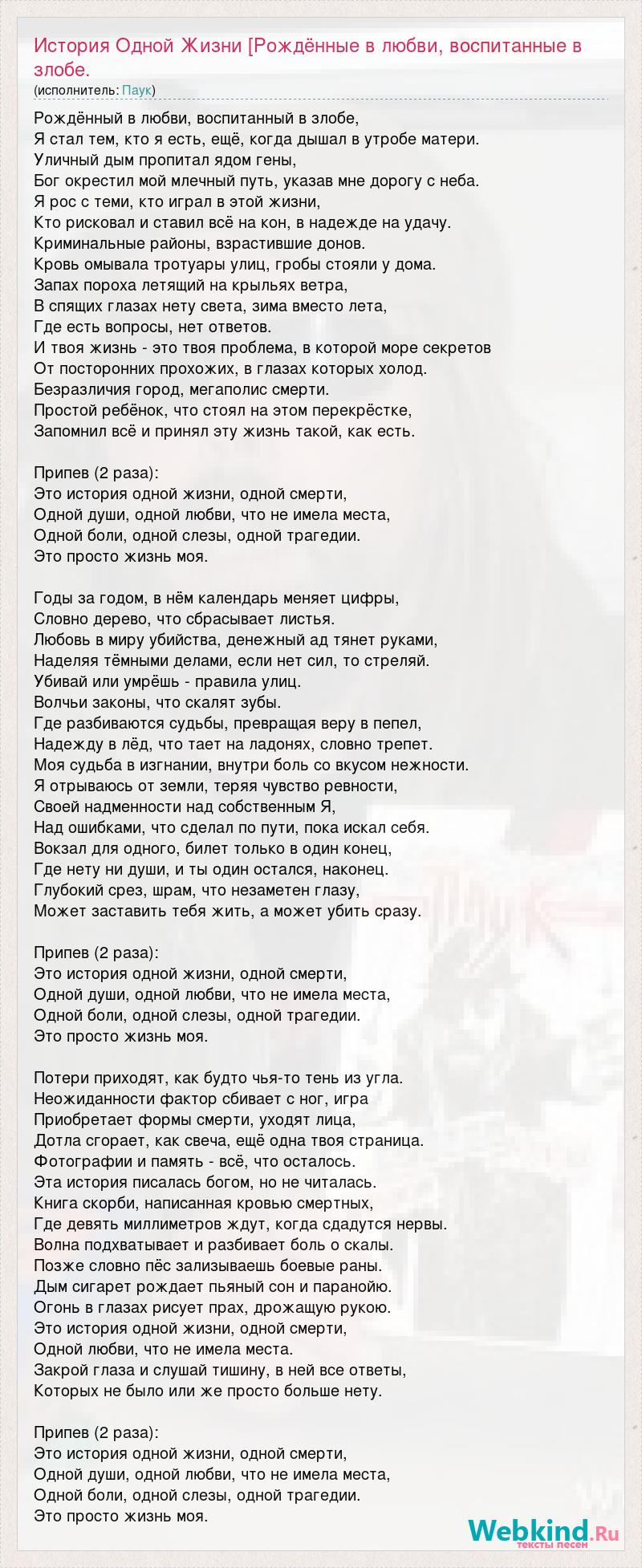 Рождённый в любви, воспитанный в злобе, Я стал тем, кто я есть, ещё, когда дышал в утробе матери. Уличный дым пропитал ядом гены, Бог окрестил мой млечный путь, указав мне дорогу с неба. Я рос с теми, кто играл в этой жизни, Кто рисковал и ставил всё на кон, в надежде на удачу. Криминальные районы, взрастившие донов. Кровь омывала тротуары улиц, гробы стояли у дома. Запах пороха летящий на крыльях ветра, В спящих глазах нету света, зима вместо лета, Где есть вопросы, нет ответов. И твоя жизнь - это твоя проблема, в которой море секретов От посторонних прохожих, в глазах которых холод. Безразличия город, мегаполис смерти. Простой ребёнок, что стоял на этом перекрёстке, Запомнил всё и принял эту жизнь такой, как есть. Припев (2 раза): Это история одной жизни, одной смерти, Одной души, одной любви, что не имела места, Одной боли, одной слезы, одной трагедии. Это просто жизнь моя. Годы за годом, в нём календарь меняет цифры, Словно дерево, что сбрасывает листья. Любовь в миру убийства, денежный ад тянет руками, Наделяя тёмными делами, если нет сил, то стреляй. Убивай или умрёшь - правила улиц. Волчьи законы, что скалят зубы. Где разбиваются судьбы, превращая веру в пепел, Надежду в лёд, что тает на ладонях, словно трепет. Моя судьба в изгнании, внутри боль со вкусом нежности. Я отрываюсь от земли, теряя чувство ревности, Своей надменности над собственным Я, Над ошибками, что сделал по пути, пока искал себя. Вокзал для одного, билет только в один конец, Где нету ни души, и ты один остался, наконец. Глубокий срез, шрам, что незаметен глазу, Может заставить тебя жить, а может убить сразу. Припев (2 раза): Это история одной жизни, одной смерти, Одной души, одной любви, что не имела места, Одной боли, одной слезы, одной трагедии. Это просто жизнь моя. Потери приходят, как будто чья-то тень из угла. Неожиданности фактор сбивает с ног, игра Приобретает формы смерти, уходят лица, Дотла сгорает, как свеча, ещё одна твоя страница. Фотографии и память - всё, что осталось. Эта история писалась богом, но не читалась. Книга скорби, написанная кровью смертных, Где девять миллиметров ждут, когда сдадутся нервы. Волна подхватывает и разбивает боль о скалы. Позже словно пёс зализываешь боевые раны. Дым сигарет рождает пьяный сон и паранойю. Огонь в глазах рисует прах, дрожащую рукою. Это история одной жизни, одной смерти, Одной любви, что не имела места. Закрой глаза и слушай тишину, в ней все ответы, Которых не было или же просто больше нету. Припев (2 раза): Это история одной жизни, одной смерти, Одной души, одной любви, что не имела места, Одной боли, одной слезы, одной трагедии. Это просто жизнь моя.
