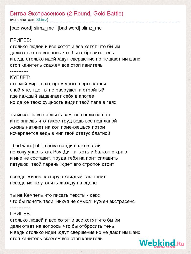 [bad word] slimz_mc | [bad word] slimz_mc ПРИПЕВ: столько людей и все хотят и все хотят что бы им дали ответ на вопросы что бы отбросить тень и ведь столько идей ждут свершение но не дают им шанс стоп канитель скажем все стоп канитель ----------- КУПЛЕТ: это мой мир.. в котором много серы, крови спой мне, где ты не разрушен а стройный где каждый выдвигает себя в апогее но даже твою сущность видит твой папа в геях ты можешь все решить сам, но сопли на пол и не знаешь что такое труд ведь все под лапой жизнь натянет на кол поменяешься потом исчерпается ведь в миг твой статус блатной [bad word] off.. снова среди волков стаи не хочу упасть как Рэм Дигга, хоть и балкон с краю и мне не составит, труда тебя на понт сплавить петушок, твой парень ждет его стропон стоит псевдо жизнь, которую каждый так ценит псевдо мс не утолить жажду на сцене ты не Кемпель что писать тексты - секс что бы понять твой "нихуя не смысл" нужен экстрасенс ------------ ПРИПЕВ: столько людей и все хотят и все хотят что бы им дали ответ на вопросы что бы отбросить тень и ведь столько идей ждут свершение но не дают им шанс стоп канитель скажем все стоп канитель