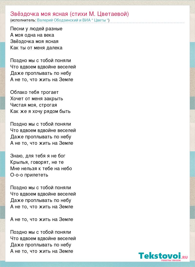 Песни у людей разные А моя одна на века Звёздочка моя ясная Как ты от меня далека Поздно мы с тобой поняли Что вдвоем вдвойне веселей Даже проплывать по небу А не то, что жить на Земле Облако тебя трогает Хочет от меня закрыть Чистая моя, строгая Как же я хочу рядом быть Поздно мы с тобой поняли Что вдвоем вдвойне веселей Даже проплывать по небу А не то, что жить на Земле Знаю, для тебя я не бог Крылья, говорят, не те Мне нельзя к тебе на небо О-о-о прилететь Поздно мы с тобой поняли Что вдвоем вдвойне веселей Даже проплывать по небу А не то, что жить на Земле А не то, что жить на Земле Поздно мы с тобой поняли Что вдвоем вдвойне веселей Даже проплывать по небу А не то, что жить на Земле