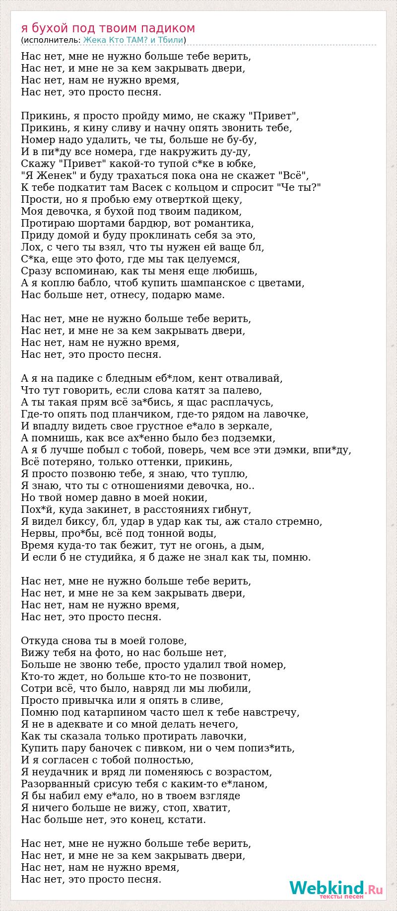 Нас нет, мне не нужно больше тебе верить, Нас нет, и мне не за кем закрывать двери, Нас нет, нам не нужно время, Нас нет, это просто песня. Прикинь, я просто пройду мимо, не скажу "Привет", Прикинь, я кину сливу и начну опять звонить тебе, Номер надо удалить, че ты, больше не бу-бу, И в пи*ду все номера, где накружить ду-ду, Скажу "Привет" какой-то тупой с*ке в юбке, "Я Женек" и буду трахаться пока она не скажет "Всё", К тебе подкатит там Васек с кольцом и спросит "Че ты?" Прости, но я пробью ему отверткой щеку, Моя девочка, я бухой под твоим падиком, Протираю шортами бардюр, вот романтика, Приду домой и буду проклинать себя за это, Лох, с чего ты взял, что ты нужен ей ваще бл, С*ка, еще это фото, где мы так целуемся, Сразу вспоминаю, как ты меня еще любишь, А я коплю бабло, чтоб купить шампанское с цветами, Нас больше нет, отнесу, подарю маме. Нас нет, мне не нужно больше тебе верить, Нас нет, и мне не за кем закрывать двери, Нас нет, нам не нужно время, Нас нет, это просто песня. А я на падике с бледным еб*лом, кент отваливай, Что тут говорить, если слова катят за палево, А ты такая прям всё за*бись, я щас расплачусь, Где-то опять под планчиком, где-то рядом на лавочке, И впадлу видеть свое грустное е*ало в зеркале, А помнишь, как все ах*енно было без подземки, А я б лучше побыл с тобой, поверь, чем все эти дэмки, впи*ду, Всё потеряно, только оттенки, прикинь, Я просто позвоню тебе, я знаю, что туплю, Я знаю, что ты с отношениями девочка, но.. Но твой номер давно в моей нокии, Пох*й, куда закинет, в расстояниях гибнут, Я видел биксу, бл, удар в удар как ты, аж стало стремно, Нервы, про*бы, всё под тонной воды, Время куда-то так бежит, тут не огонь, а дым, И если б не студийка, я б даже не знал как ты, помню. Нас нет, мне не нужно больше тебе верить, Нас нет, и мне не за кем закрывать двери, Нас нет, нам не нужно время, Нас нет, это просто песня. Откуда снова ты в моей голове, Вижу тебя на фото, но нас больше нет, Больше не звоню тебе, просто удалил твой номер, Кто-то ждет, но больше кто-то не позвонит, Сотри всё, что было, навряд ли мы любили, Просто привычка или я опять в сливе, Помню под катарпином часто шел к тебе навстречу, Я не в адеквате и со мной делать нечего, Как ты сказала только протирать лавочки, Купить пару баночек с пивком, ни о чем попиз*ить, И я согласен с тобой полностью, Я неудачник и вряд ли поменяюсь с возрастом, Разорванный срисую тебя с каким-то е*ланом, Я бы набил ему е*ало, но в твоем взгляде Я ничего больше не вижу, стоп, хватит, Нас больше нет, это конец, кстати. Нас нет, мне не нужно больше тебе верить, Нас нет, и мне не за кем закрывать двери, Нас нет, нам не нужно время, Нас нет, это просто песня.