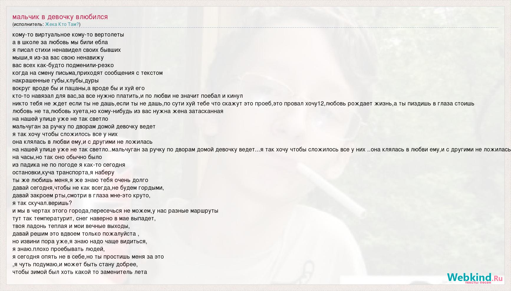 кому-то виртуальное кому-то вертолеты а в школе за любовь мы били ебла я писал стихи ненавидел своих бывших мыши,я из-за вас свою ненавижу вас всех как-будто подменили-резко когда на смену письма,приходят сообщения с текстом накрашенные губы,клубы,дуры вокруг вроде бы и пацаны,а вроде бы и хуй его кто-то навязал для вас,за все нужно платить,и по любви не значит поебал и кинул никто тебя не ждет если ты не дашь,если ты не дашь,по сути хуй тебе что скажут это проеб,это провал хочу12,любовь рождает жизнь,а ты пиздишь в глаза стоишь любовь не та,любовь хуета,но кому-нибудь из вас нужна жена затасканная на нашей улице уже не так светло мальчуган за ручку по дворам домой девочку ведет я так хочу чтобы сложилось все у них она клялась в любви ему,и с другими не ложилась на нашей улице уже не так светло..мальчуган за ручку по дворам домой девочку ведет...я так хочу чтобы сложилось все у них ..она клялась в любви ему,и с другими не ложилась на часы,но так оно обычно было из падика не по погоде я как-то сегодня остановки,куча транспорта,я наберу ты же любишь меня,я же знаю тебя очень долго давай сегодня,чтобы не как всегда,не будем гордыми, давай закроем рты,смотри в глаза мне-это круто, я так скучал.веришь? и мы в чертах этого города,пересечься не можем,у нас разные маршруты тут так температурит, снег наверно в мае выпадет, твоя ладонь теплая и мои вечные выходы, давай решим это вдвоем только пожалуйста , но извини пора уже,я знаю надо чаще видиться, я знаю.плохо проебывать людей, я сегодня опять не в себе,но ты простишь меня за это ,я чуть подумаю,и может быть стану добрее, чтобы зимой был хоть какой то заменитель лета