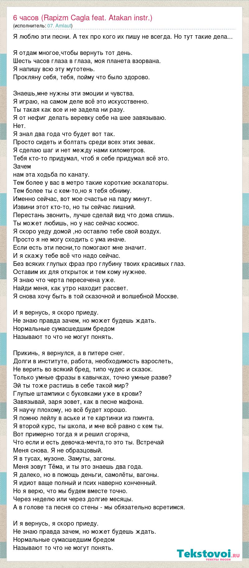 Я люблю эти песни. А тех про кого их пишу не всегда. Но тут такие дела... Я отдам многое,чтобы вернуть тот день. Шесть часов глаза в глаза, моя планета взорвана. Я напишу всю эту мутотень. Прокляну себя, тебя, пойму что было здорово. Знаешь,мне нужны эти эмоции и чувства. Я играю, на самом деле всё это искусственно. Ты такая как все и не задела ни разу. Я от нефиг делать веревку себе на шее завязываю. Нет. Я знал два года что будет вот так. Просто сидеть и болтать среди всех этих зевак. Я сделаю шаг и нет между нами километров. Тебя кто-то придумал, чтоб я себе придумал всё это. Зачем нам эта ходьба по канату. Тем более у вас в метро такие короткие эскалаторы. Тем более ты с кем-то,но я тебя обниму. Именно сейчас, вот мое счастье на пару минут. Извини этот кто-то, но ты сейчас лишний. Перестань звонить, лучше сделай вид что дома спишь. Ты может любишь, но у нас сейчас космос. Я скоро уеду домой ,но оставлю тебе свой воздух. Просто я не могу сходить с ума иначе. Если есть эти песни,то помогают мне значит. И я скажу тебе всё что надо сейчас. Без всяких глупых фраз про глубину твоих красивых глаз. Оставим их для открыток и тем кому нужнее. Я знаю что черта пересечена уже. Найди меня, как утро находит рассвет. Я снова хочу быть в той сказочной и волшебной Москве. И я вернусь, я скоро приеду. Не знаю правда зачем, но может будешь ждать. Нормальные сумасшедшим бредом Называют то что не могут понять. Прикинь, я вернулся, а в питере снег. Долги в институте, работа, необходимость взрослеть, Не верить во всякий бред, типо чудес и сказок. Только умные фразы в кавычках, точно умные разве? Эй ты тоже растишь в себе такой мир? Глупые штампики с буковками уже в крови? Завязывай, заря зовет, как в песне мафона. Я научу плохому, но всё будет хорошо. Я помню лейлу в аське и те картинки из пэинта. Я второй курс, ты школа, и мне всё равно с кем ты. Вот примерно тогда я и решил сгоряча, Что если и есть девочка-мечта,то это ты. Встречай Меня снова. Я не образцовый. Я в тусах, музоне. Замуты, загоны. Меня зовут Тёма, и ты это знаешь два года. Я далеко, но в помощь деньги, самолёты, вагоны. Я идиот ваще полный и псих наверно конченный. Но я верю, что мы будем вместе точно. Через неделю или через долгие месяцы. А в голове та песня со стены - мы обязательно всретимся. И я вернусь, я скоро приеду. Не знаю правда зачем, но может будешь ждать. Нормальные сумасшедшим бредом Называют то что не могут понять.