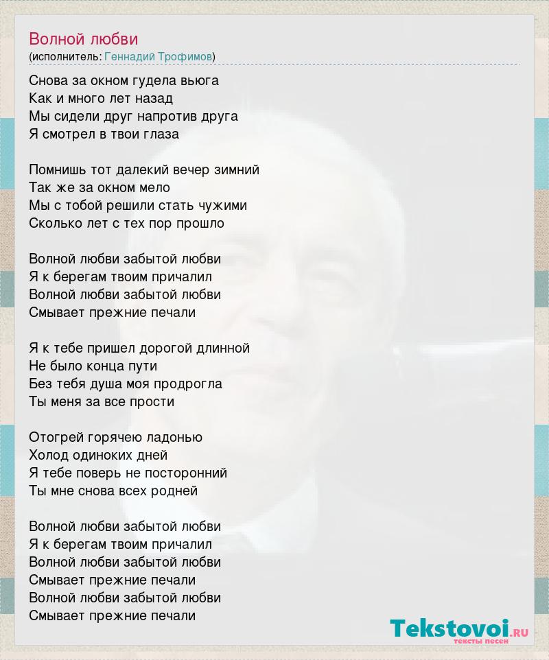 Снова за окном гудела вьюга Как и много лет назад Мы сидели друг напротив друга Я смотрел в твои глаза Помнишь тот далекий вечер зимний Так же за окном мело Мы с тобой решили стать чужими Сколько лет с тех пор прошло Волной любви забытой любви Я к берегам твоим причалил Волной любви забытой любви Смывает прежние печали Я к тебе пришел дорогой длинной Не было конца пути Без тебя душа моя продрогла Ты меня за все прости Отогрей горячею ладонью Холод одиноких дней Я тебе поверь не посторонний Ты мне снова всех родней Волной любви забытой любви Я к берегам твоим причалил Волной любви забытой любви Смывает прежние печали Волной любви забытой любви Смывает прежние печали